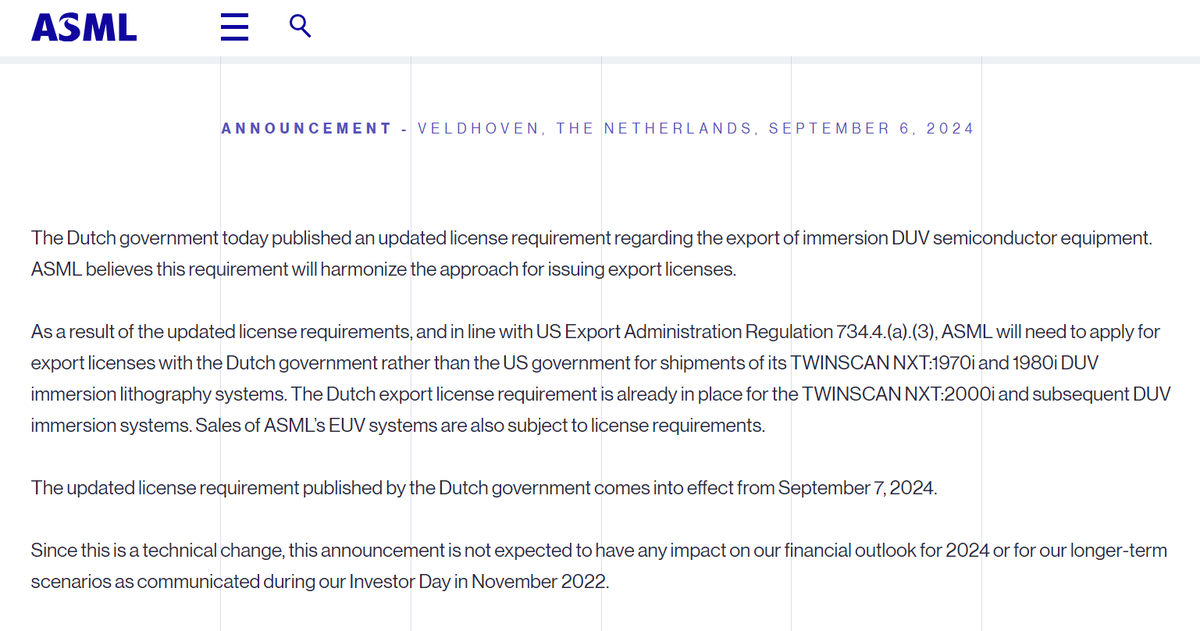 ASML最新声明显示,新规意味着ASML需要向荷兰政府申请出口许可证(而非美国)以出口TWINSCAN NXT:1970i和1980i DUV浸没式光刻系统(用于制作38纳米低端芯片)。 https://t.co/176788Wjmw