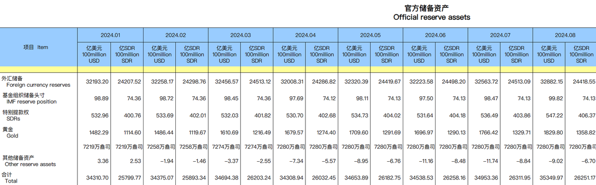 #数据 中国央行连续第4个月停止黄金增仓,8月末黄金储备维持在7280万盎司,以美元计增加63.38亿美元。8月末外汇储备环比增加318.43亿美元至32882.15亿美元。 https://t.co/tjhbQkiJUh