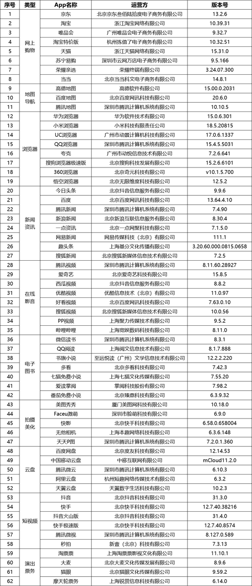 中国网络空间安全协会:包括京东、淘宝天猫、唯品会、百度、今日头条、抖音、快手、哔哩哔哩等62款App已完成个人信息收集使用方面的合规整改。 https://t.co/OEIYcUEobt
