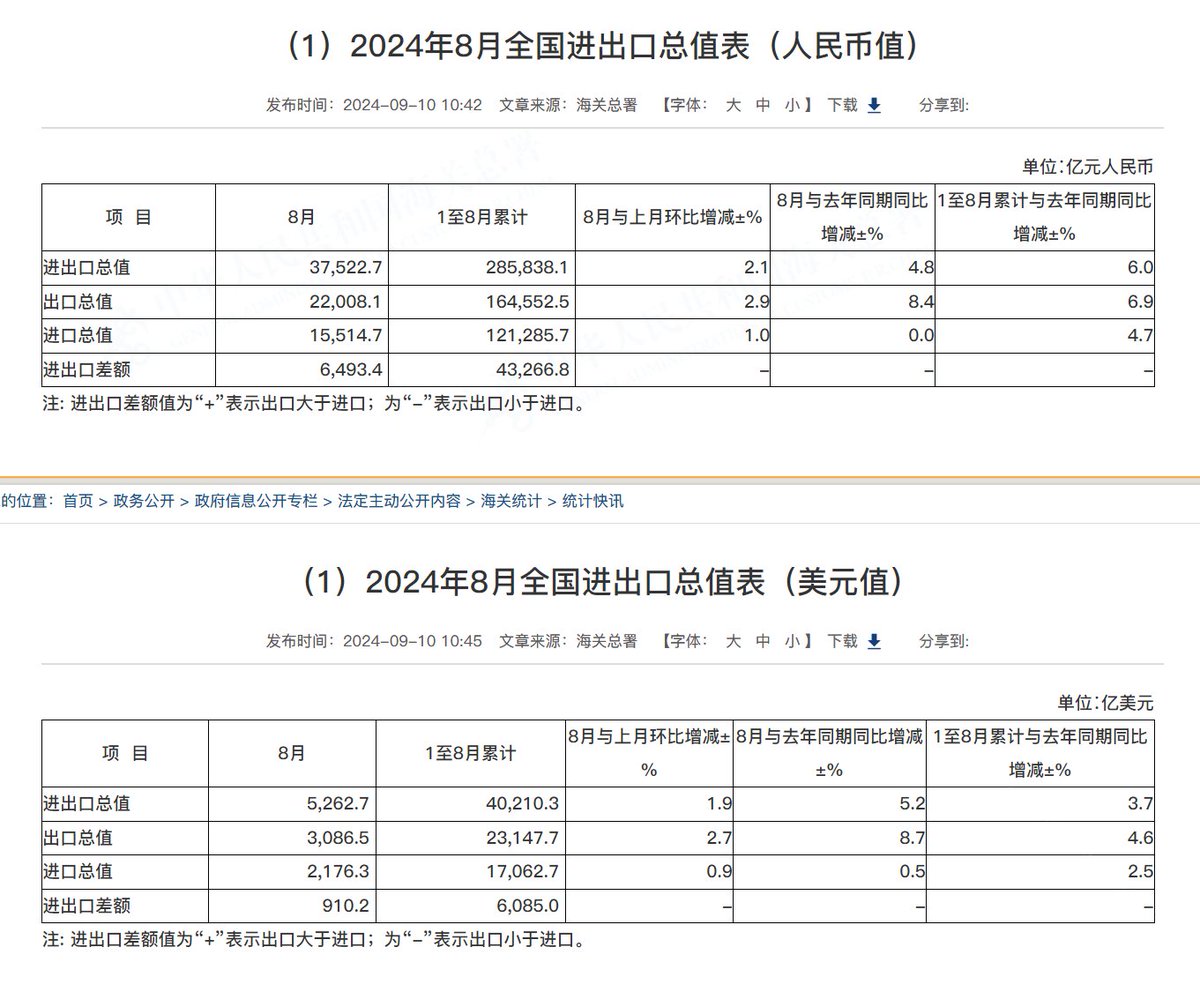 按美元计,中国8月出口同比增8.7%(预期增6.6%);进口同比增0.5%(预期增2.3%)。贸易顺差910.2亿美元,预期815亿美元,前值846.5亿美元。