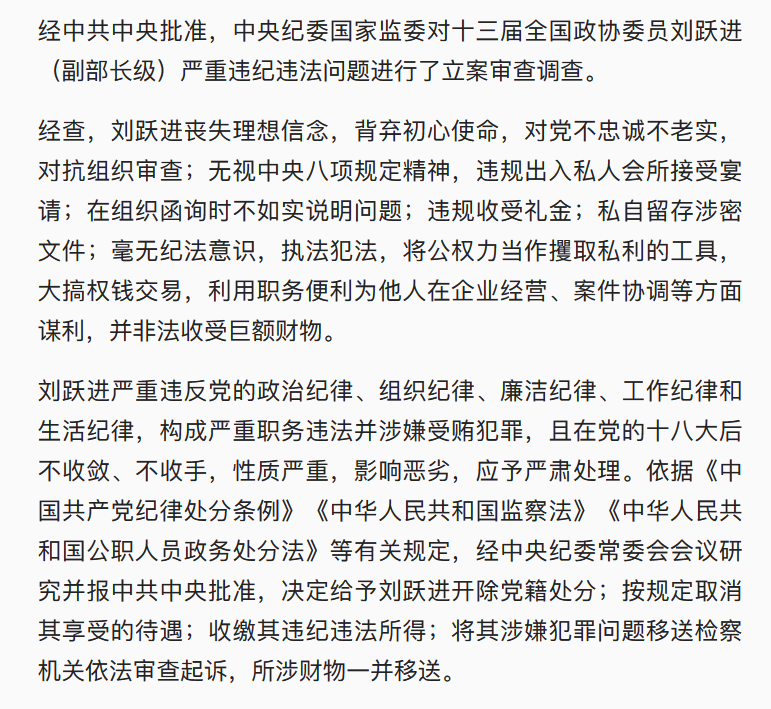 第十三届全国政协委员刘跃进(副部长级)严重违纪违法被开除党籍。 https://t.co/UmIgzndou0
