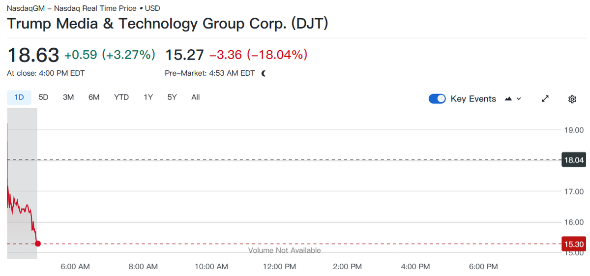 #行情 特朗普媒体科技集团 $DJT 盘前股价跌幅进一步扩大至18%。 https://t.co/3fgf2dUFFc