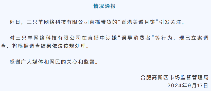 合肥高新区市场监督管理局发布情况通报称,近日,三只羊网络科技有限公司直播带货的“香港美诚月饼”引发关注。对三只羊网络科技有限公司在直播中涉嫌“误导消费者”等行为,现已立案调查,将根据调查结果依法依规处理。 https://t.co/dSHL3kzbuz