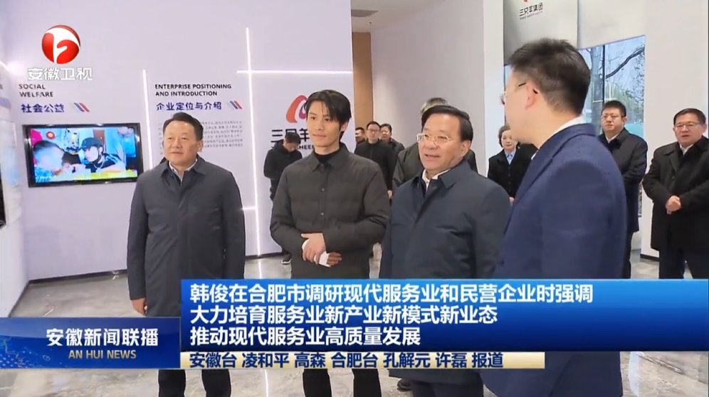 今年2月21日,时任安徽省委书记韩俊在合肥市调研现代服务业和民营企业发展情况,三只羊公司创始人之一、网名为“疯狂大杨哥”的电商主播张开杨陪同韩俊一行调研。