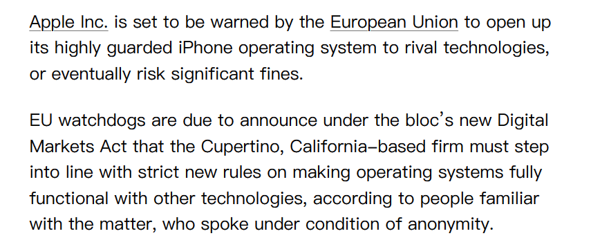 #突发 #新闻 彭博社报道,欧盟警告要求苹果开放iPhone操作系统iOS,遵守严格新的《数字市场法案》使iOS与其他技术平台兼容,否则苹果将面临巨额罚款。 https://t.co/mcH6BGBglJ