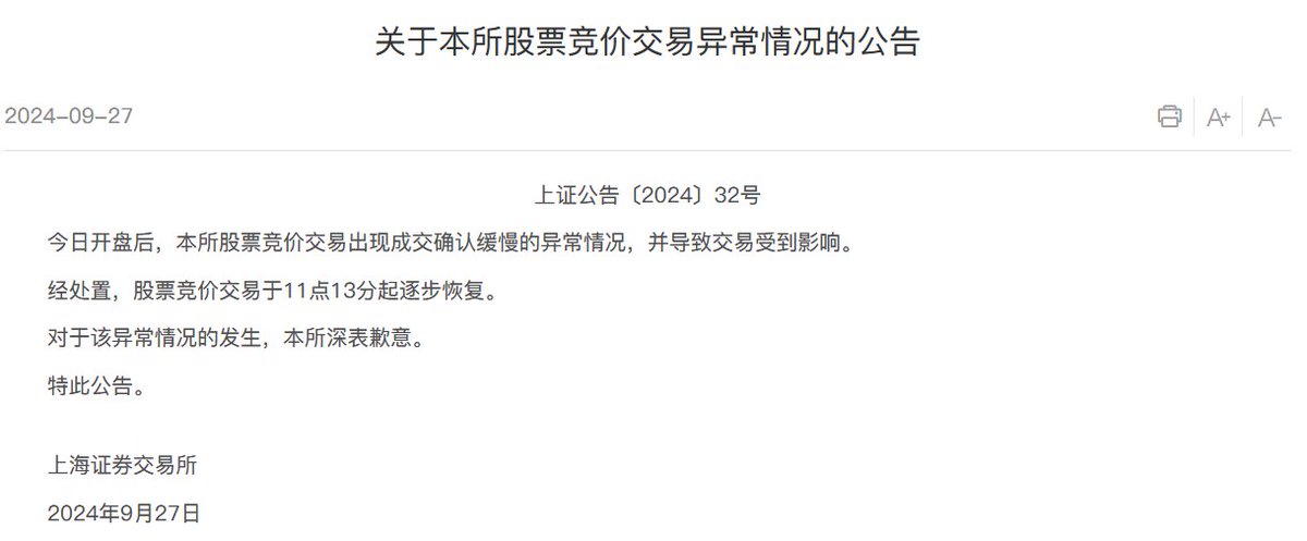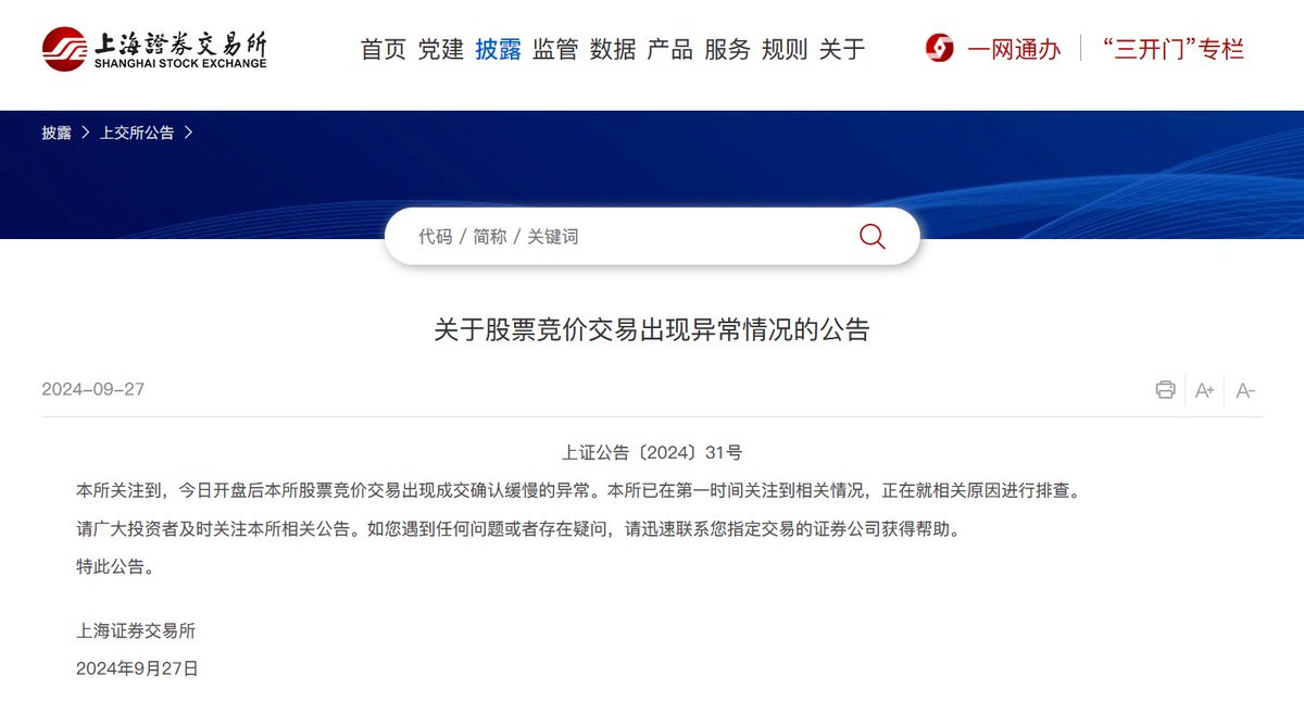 #后续 上交所公告:本所关注到,今日开盘后本所股票竞价交易出现成交确认缓慢的异常。本所已在第一时间关注到相关情况,正在就相关原因进行排查。 https://t.co/5OJbTgdcQy