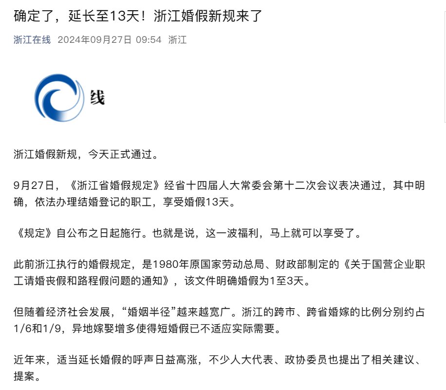 浙江通过新规,将婚假从3天延长到13天。 https://t.co/1J6bONNYKY