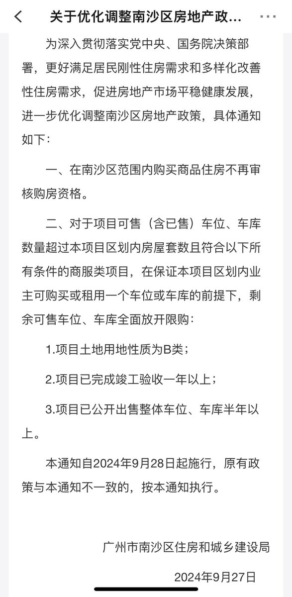 广州市南沙区:在南沙区范围内购买商品住房不再审核购房资格。对于项目可售(含已售)车位、车库数量超过本项目区划内房屋套数且符合条件的商服类项目,在保证本项目区划内业主可购买或租用一个车位或车库的前提下,剩余可售车位、车库全面放开限购。 https://t.co/C8OnOI62ZV
