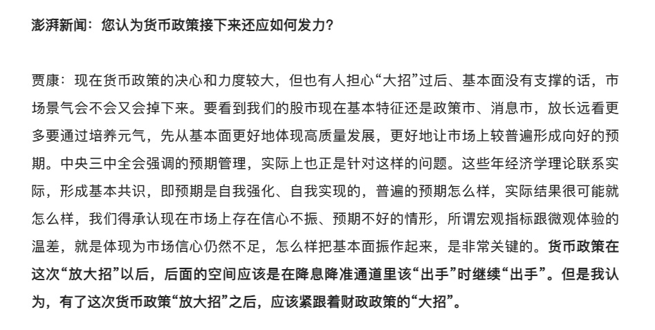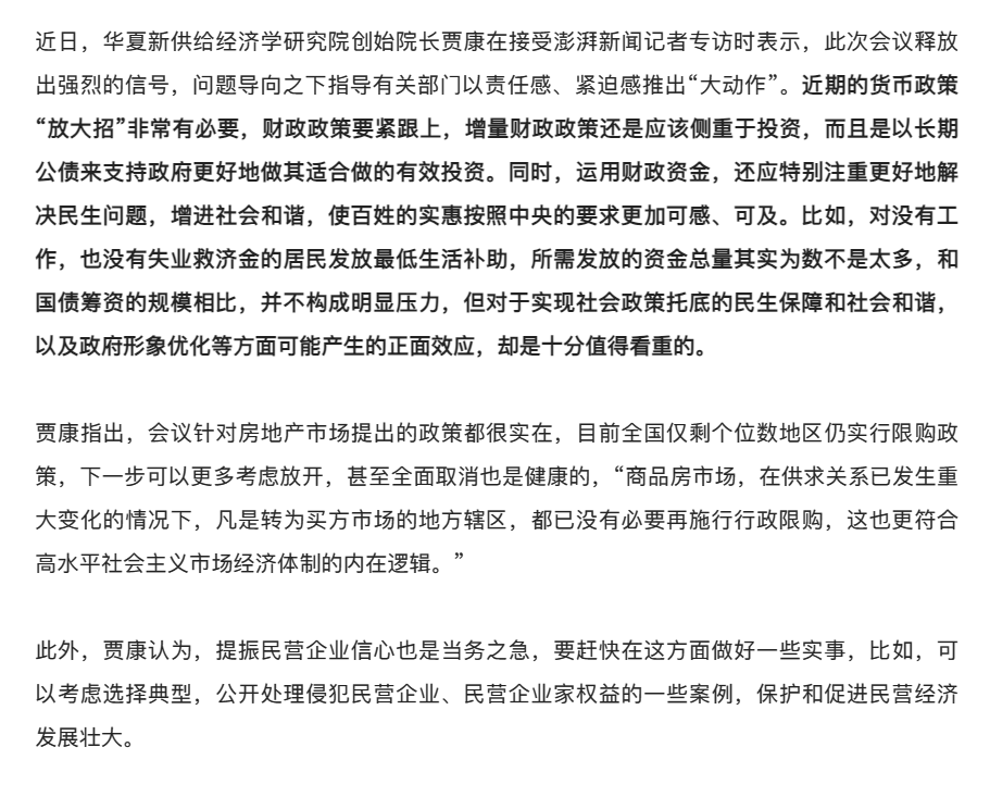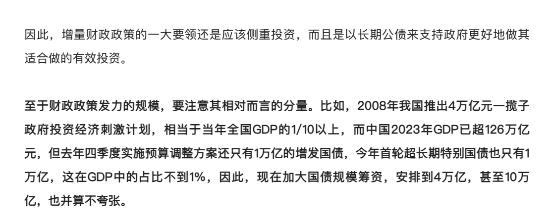 中国财政科学研究院研究员贾康:有了这次货币政策“放大招”之后,应该紧跟着财政政策的“大招”。2008年推出4万亿元一揽子政府投资经济刺激计划,相当于当年全国GDP的1/10以上,而中国2023年GDP已超126万亿元。因此,现在加大国债规模筹资,安排到4万亿,甚至10万亿,也并算不夸张。 https://t.co/NyGLtkhPyD