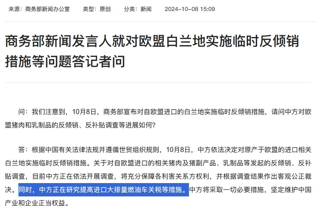中国商务部新闻发言人:中方正在研究提高进口大排量燃油车关税等措施。 https://t.co/5HgeTiNtH6