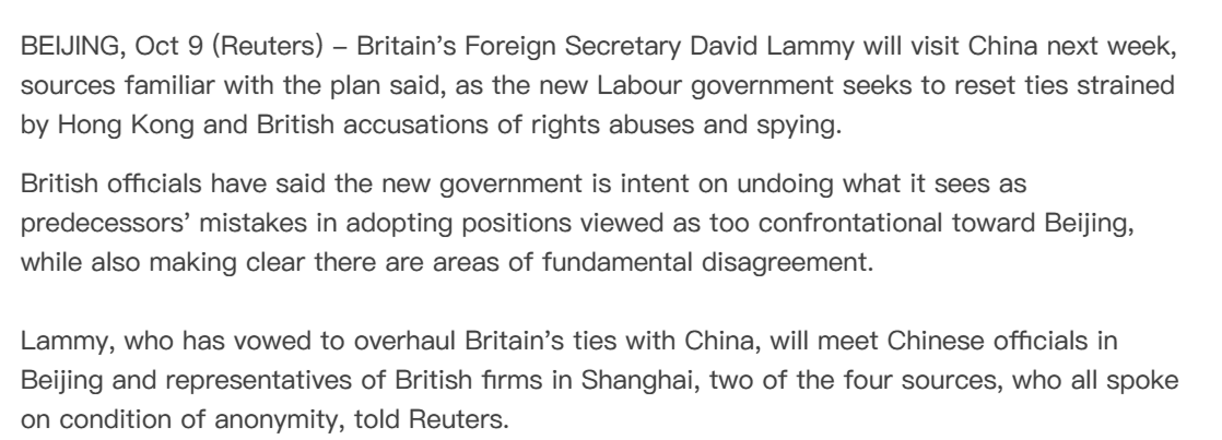 英国官员表示,新政府有意纠正前任政府在采取被认为过于对抗中国政府的立场时所犯的错误,同时也明确表示双方在一些领域存在根本分歧。 https://t.co/jS2lFv799H