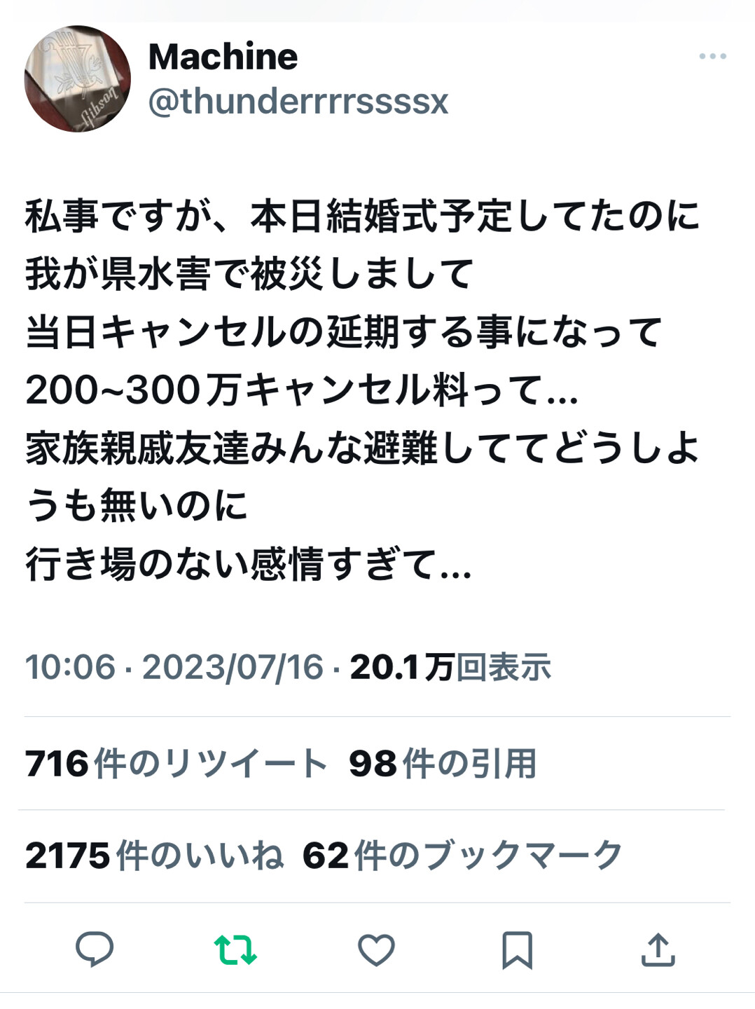 nostr:npub18sm5x8ryte5553eyrx7a7nu0wnqhp5hahs5ttggr70vkefnnsnvstzcvkh 災害や天災による中止が補償されるブライダル保険というのがあるらしいですが、この方は入っていなかったそうです。。。