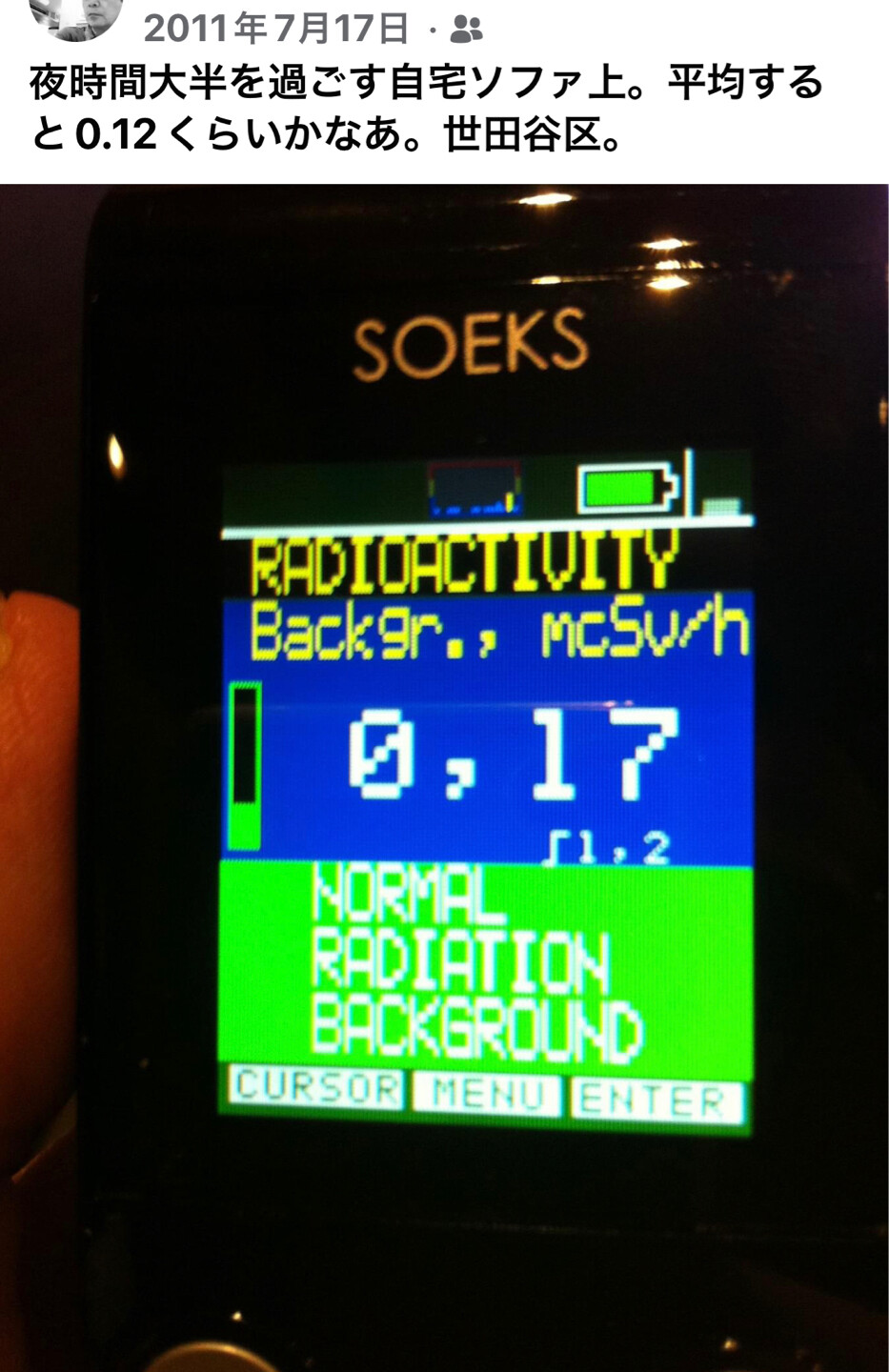 nostr:npub1dzefewry8f2jrgmkpt8ze6elj7jf37dm92w2rwuzksud7nej3rlqfz8gv5 もう引っ越してしまいましたけど、おそらく0.02-3まで落ちているのではないでしょうか。この数字は東京の平常からはとてつもなく高い数字で、チェルノブイリでは居住できない数字なんですが、当時は意味がわからなかった。