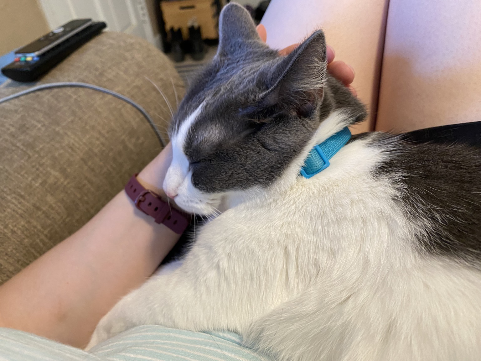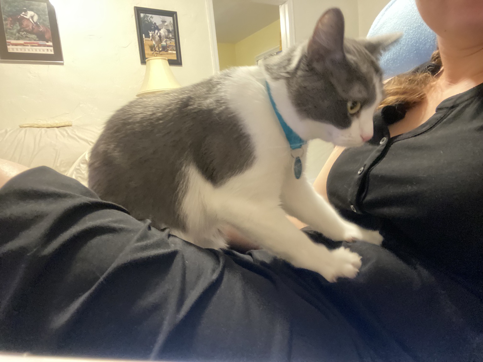 Hrmph. Abandoned us all week and still went to see the horses this morning. One of us missed you enough to sit on you even in your smelly barn clothes