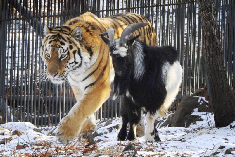 Tiger refuses to eat goat who was given to him as live food, instead, they became friends. https://t.co/C6Lx3OrjZc