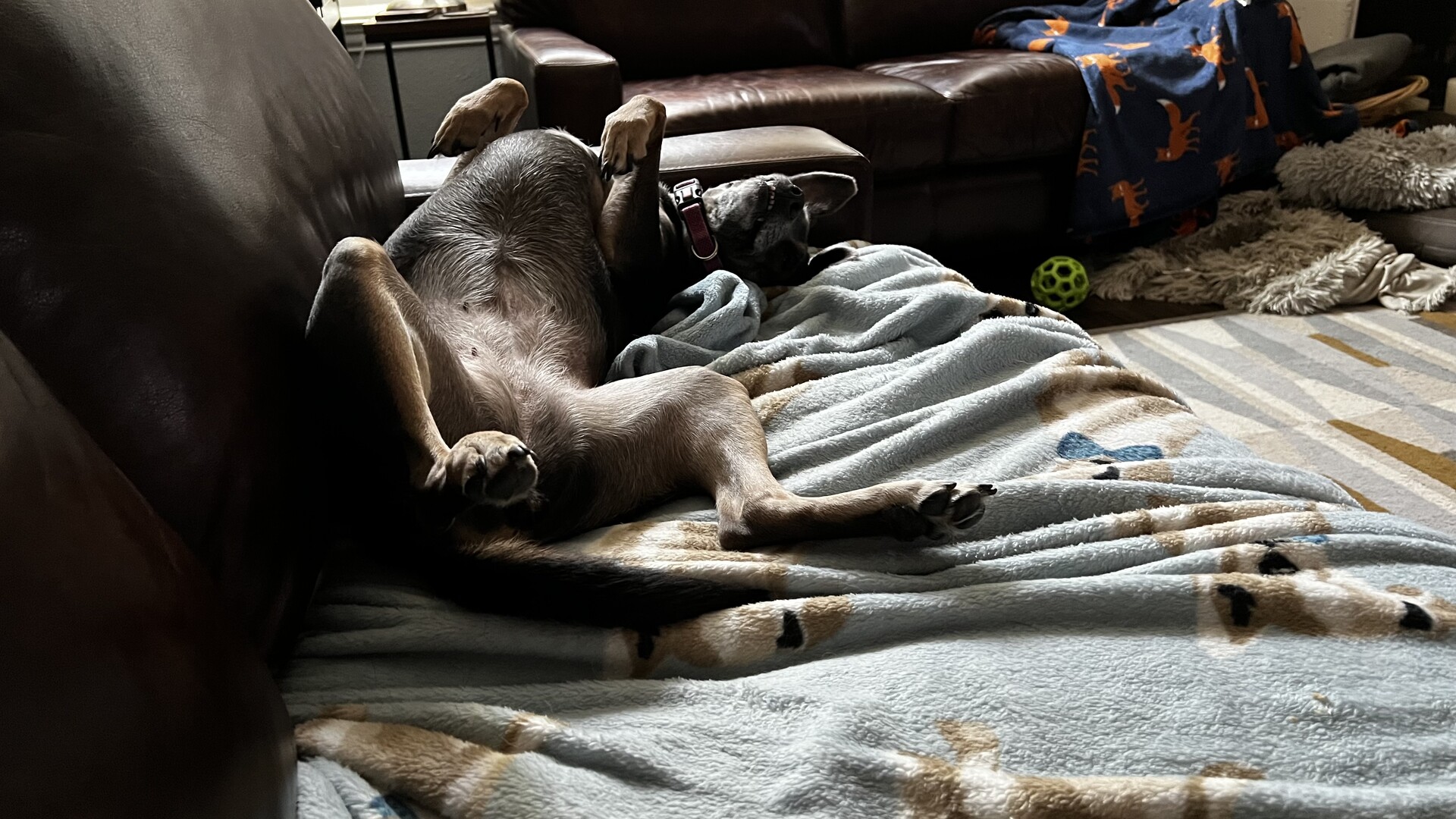 Yeah. I know. Another dog laying down on the couch, belly up.