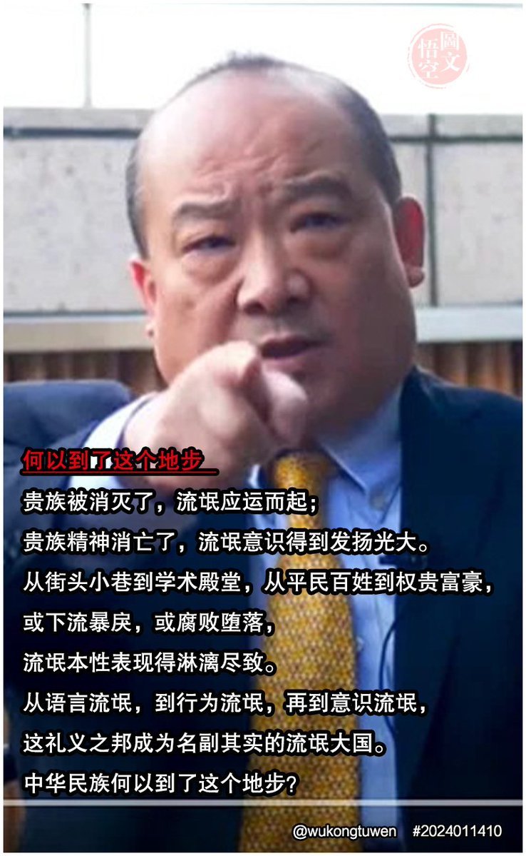 贵族被消灭了,流氓应运而起; 贵族精神消亡了,流氓意识得到发扬光大。 从街头小巷到学术殿堂,从平民百姓到权贵富豪, 或下流暴戾,或腐败堕落, 流氓本性表现得淋漓尽致。 从语言流氓,到行为流氓,再到意识流氓, 中华民族何以到了这个地步? https://t.co/Pe0ZrDjo28