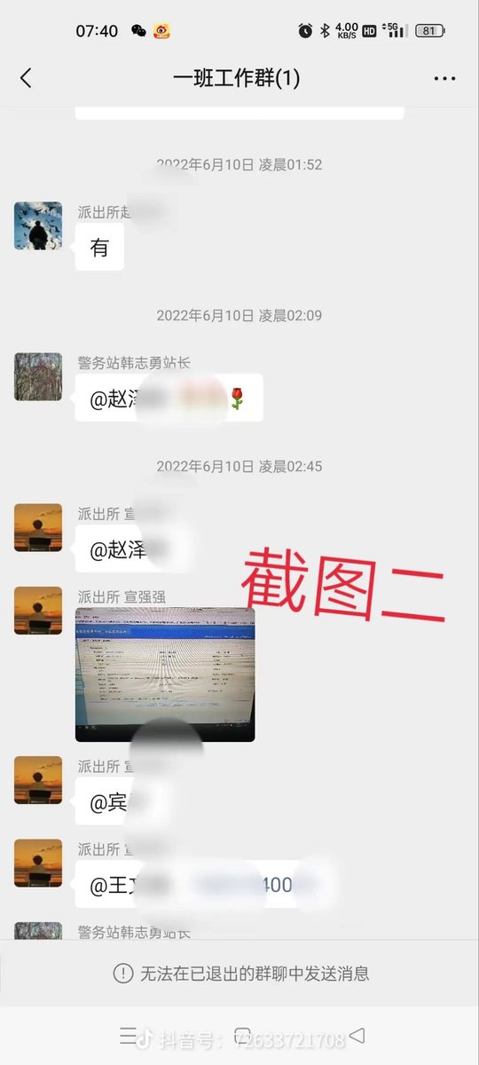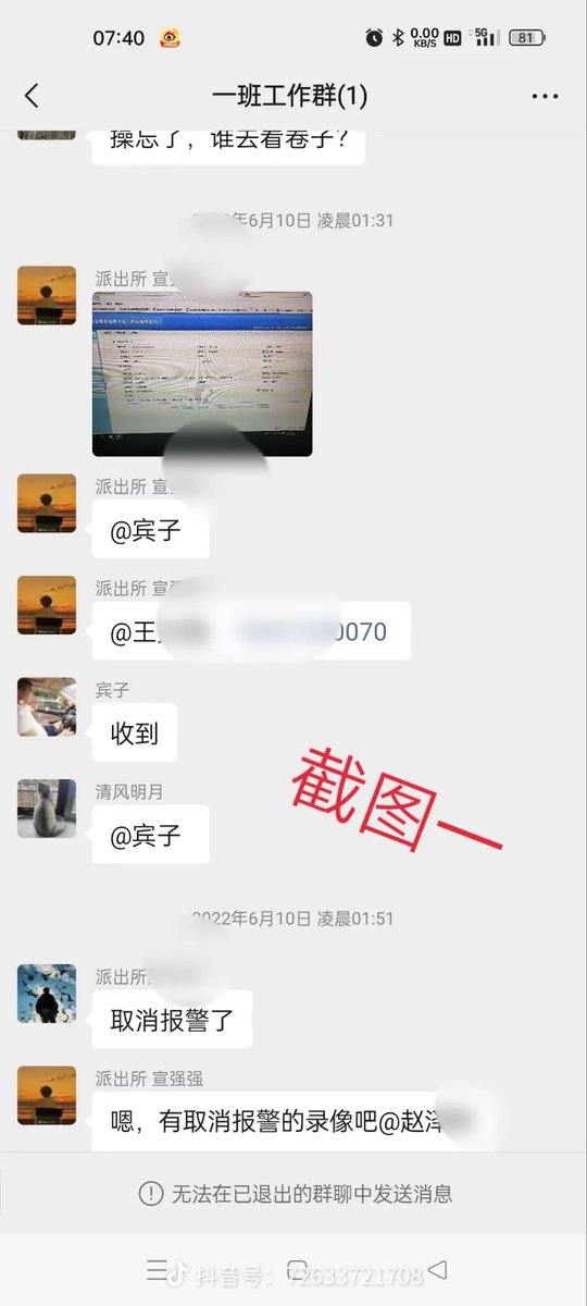 8月6日,陈志伟再度发声,称事发时值班领导正带领有关警务人员脱岗,在外饮酒,导致无法即时出警。几番沟通后才临时通知自己出警,陈志伟还公布了一段工作群聊记录证实(截至目前发文,该聊天记录已被删除)