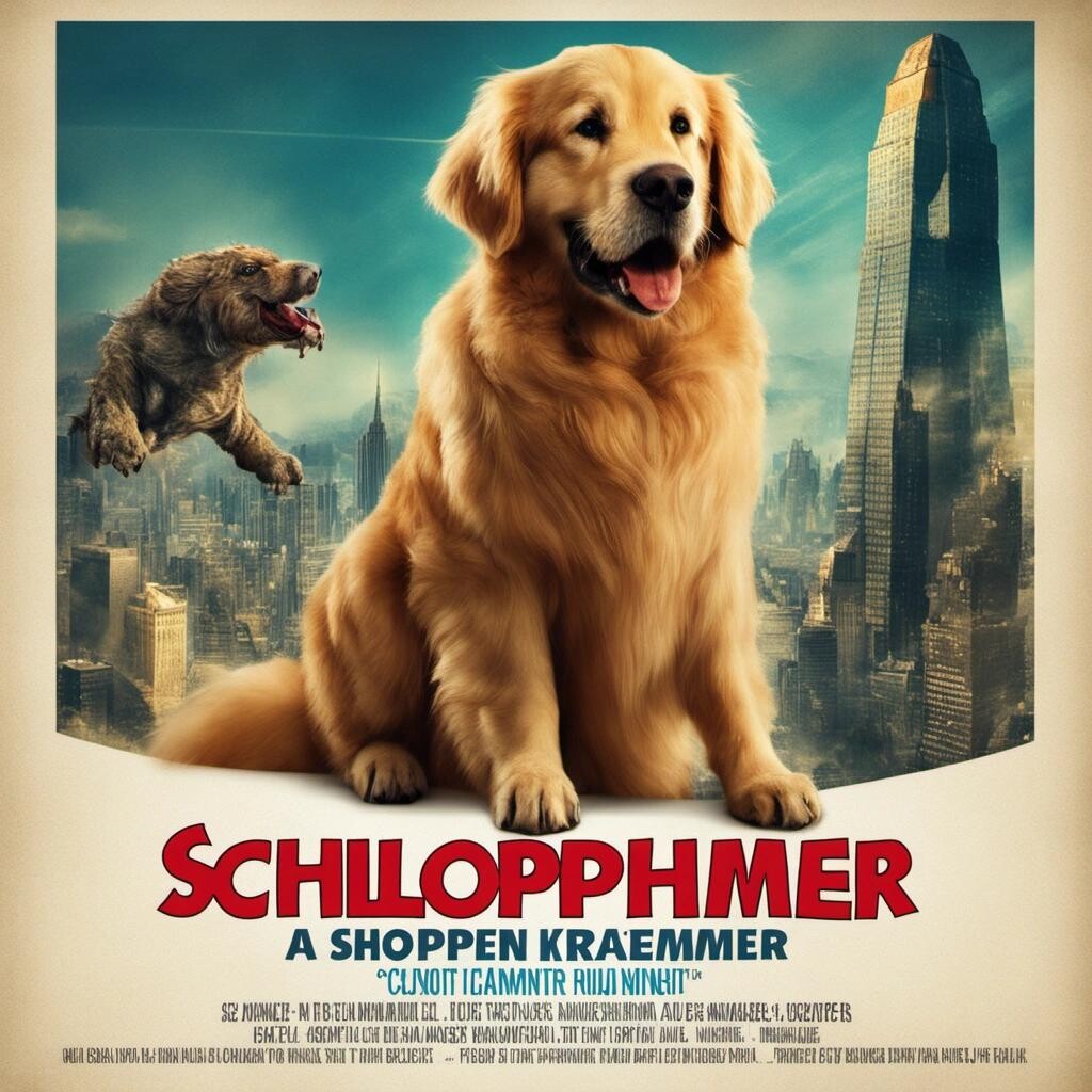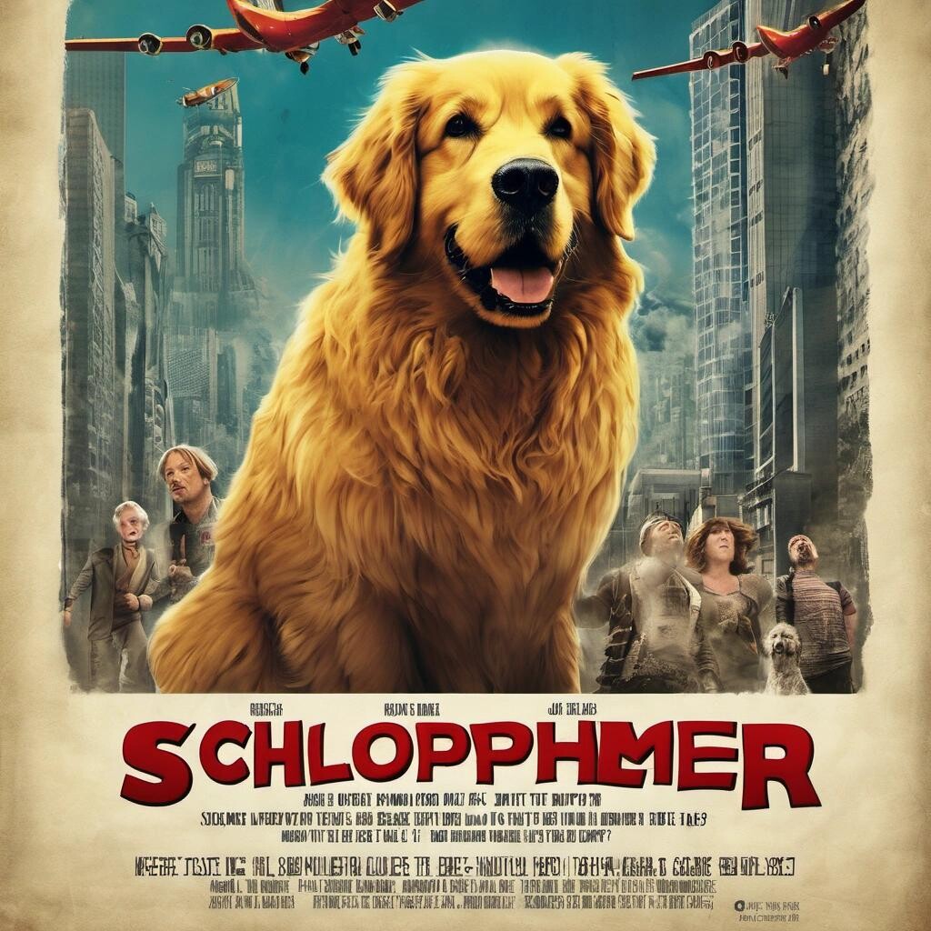 nostr:npub1p5qe4mtwxascahtp6szght2nlp06gwwwwllq7e7g6308p4y9dvys8nw2sf draw for me a movie poster for Schloppenheimer- a film about a giant kaiju golden retriever that saves humanity from gamma-irradiated monsters
