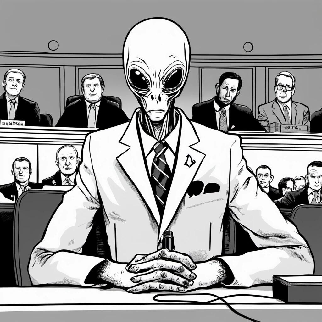 nostr:npub1p5qe4mtwxascahtp6szght2nlp06gwwwwllq7e7g6308p4y9dvys8nw2sf draw for me an alien whistleblower testifying before Congress