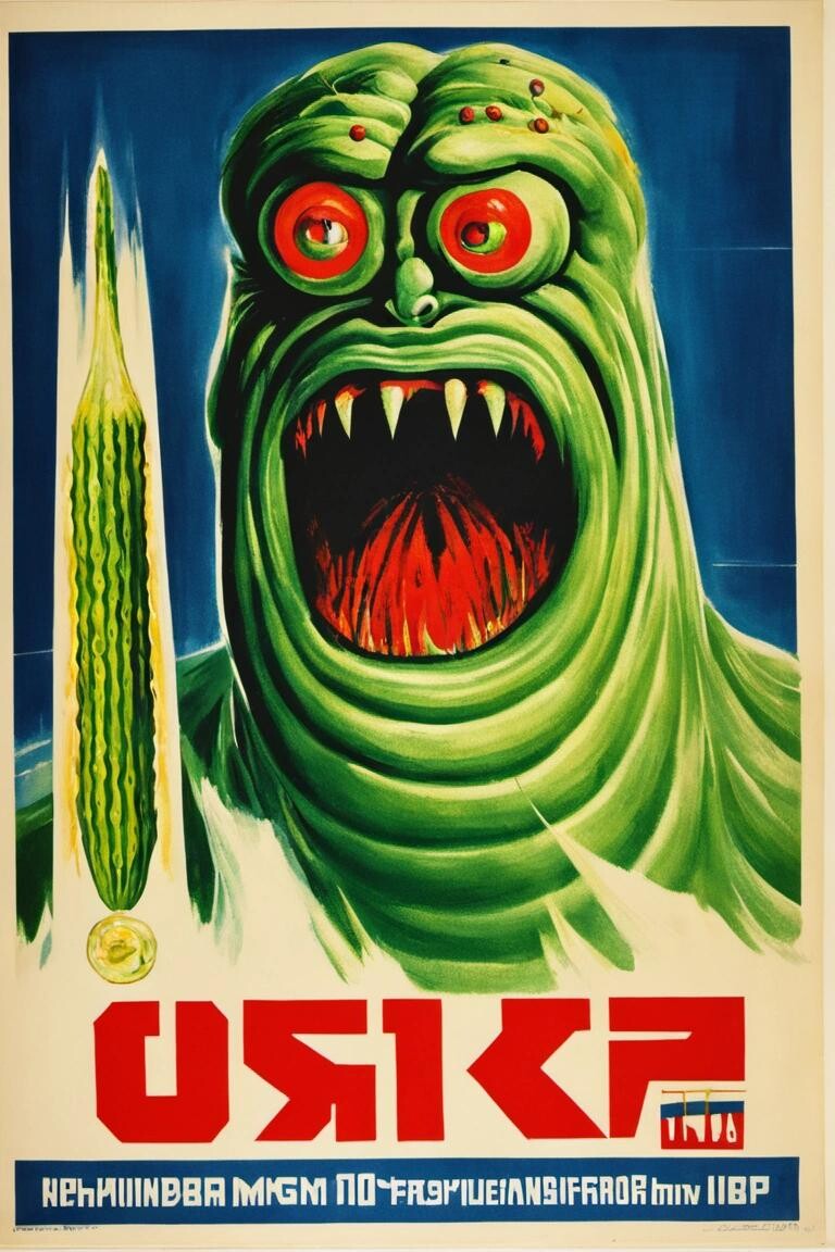 nostr:npub1p5qe4mtwxascahtp6szght2nlp06gwwwwllq7e7g6308p4y9dvys8nw2sf draw for me a cucumber monster style:mediums