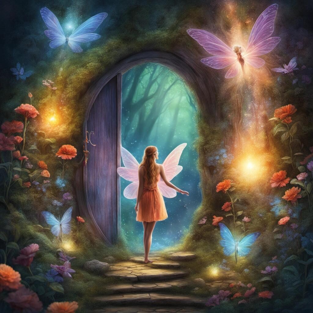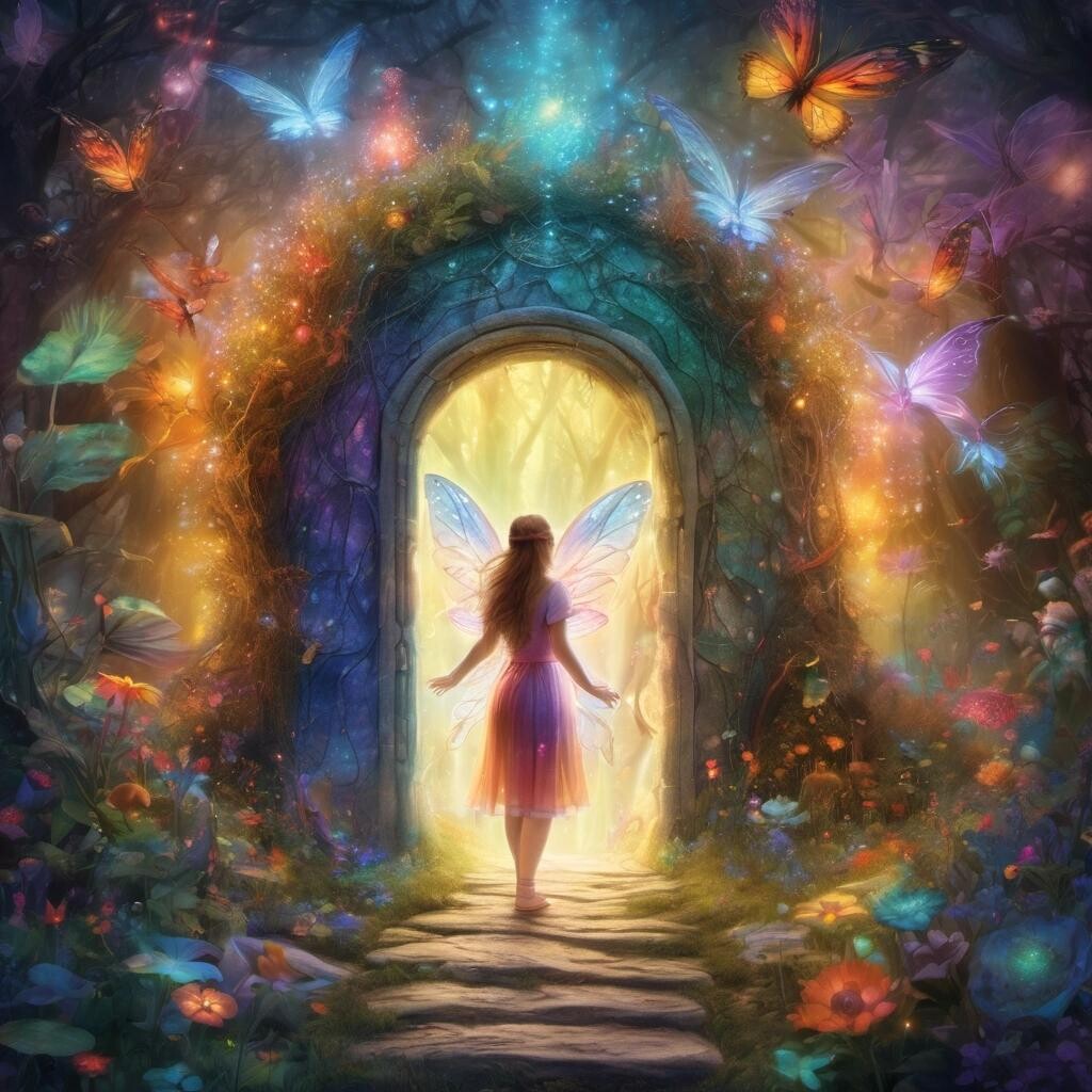Prompt: Woman about to enter a magic fairy portal, fantasy, high detail, colourful, whimsical