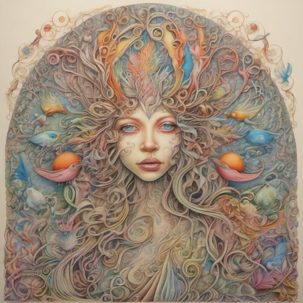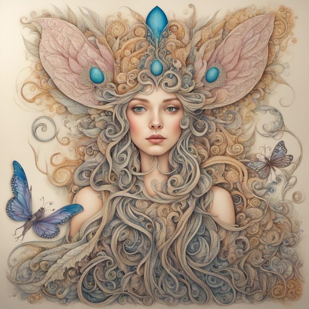 Prompt: The Fairy Queen meets the Dude, coloured pencils on coarse eggshell paper, fantasy, intricate, beautiful, high definition, crisp quality, dreamlike, weird, zentangle, surrealism, whimsical, curlicues