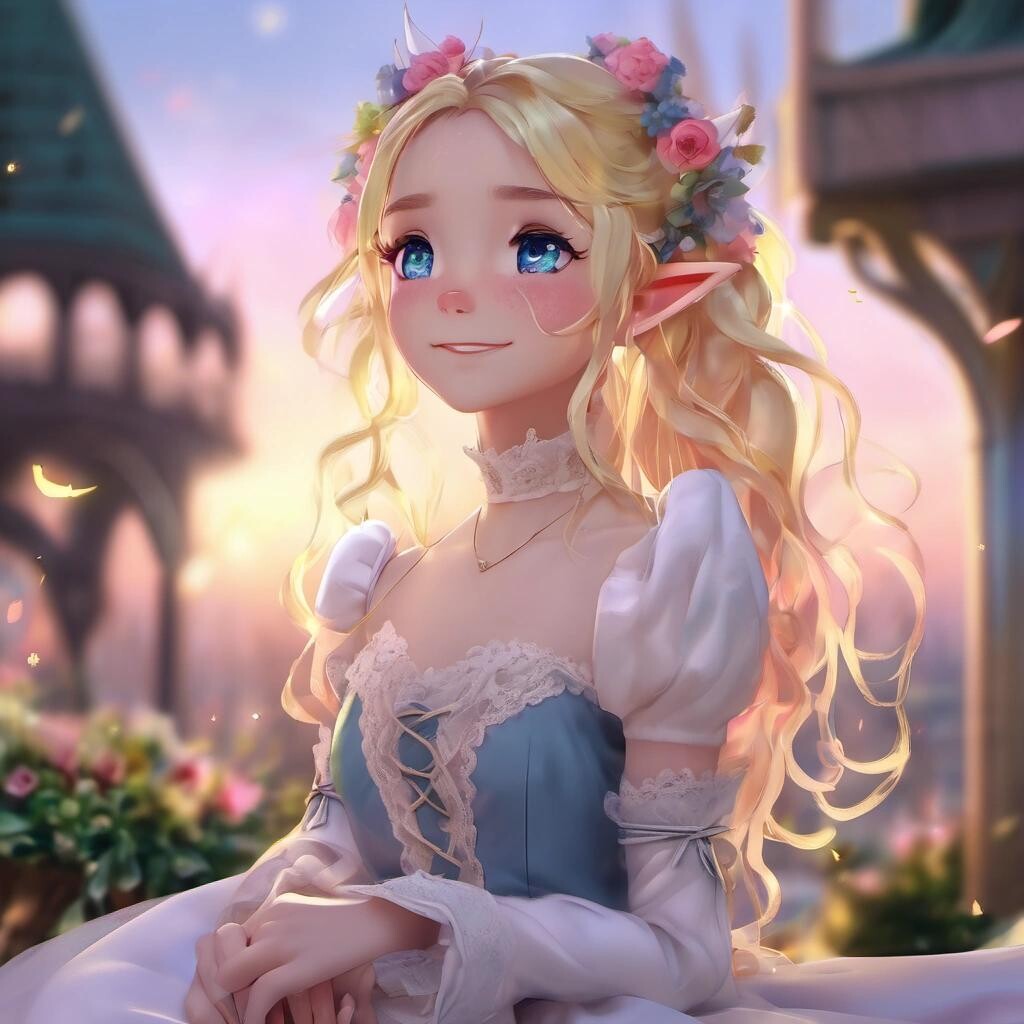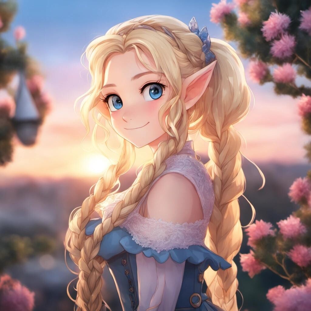 Prompt: ((elf princess)), (((pointy ears))), solo, yellow hair, blue eyes, braid, long hair, wavy hair, fluffy hair, ponytail, french braid, blush, smile, capelet, lace trim, bodice, sunset, dusk, scenery, high place, horizon, wind, wind blow, flowerbed, looking at viewer, depth of field, bokeh