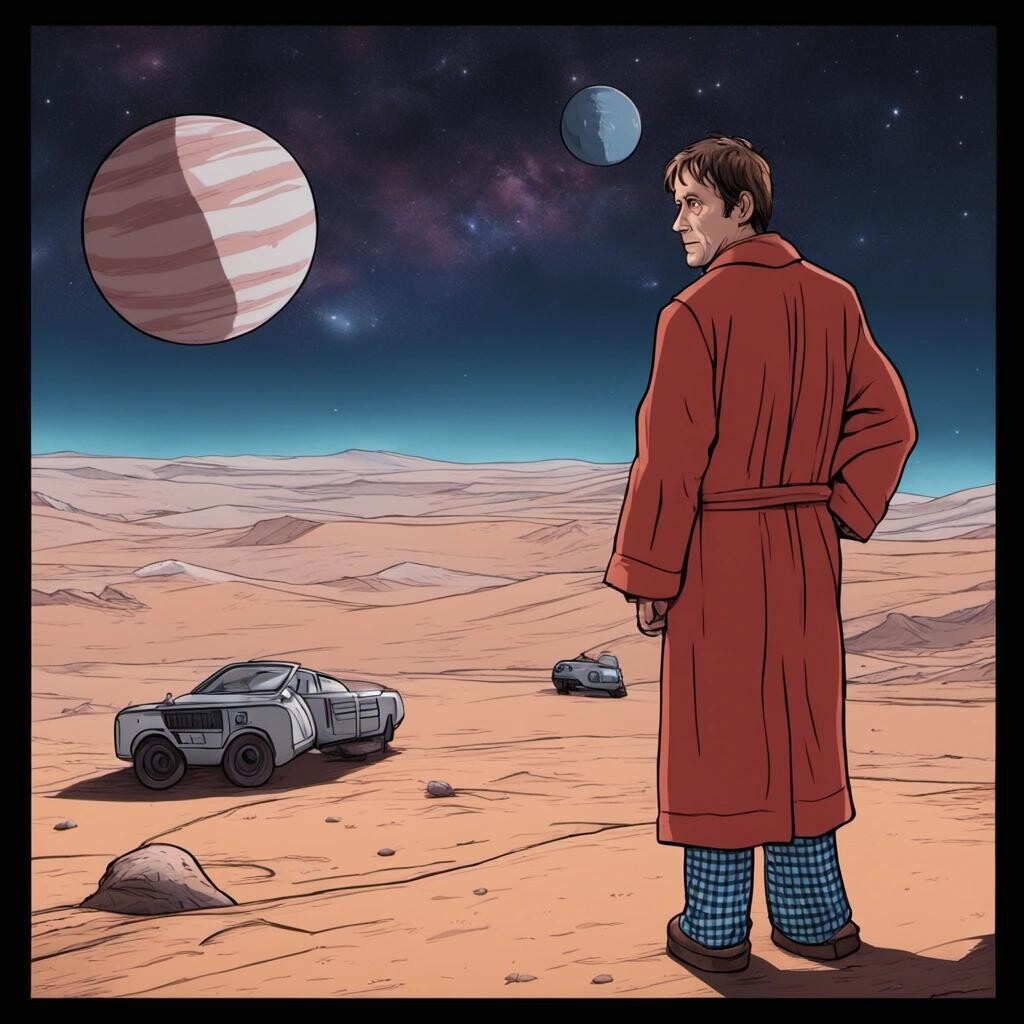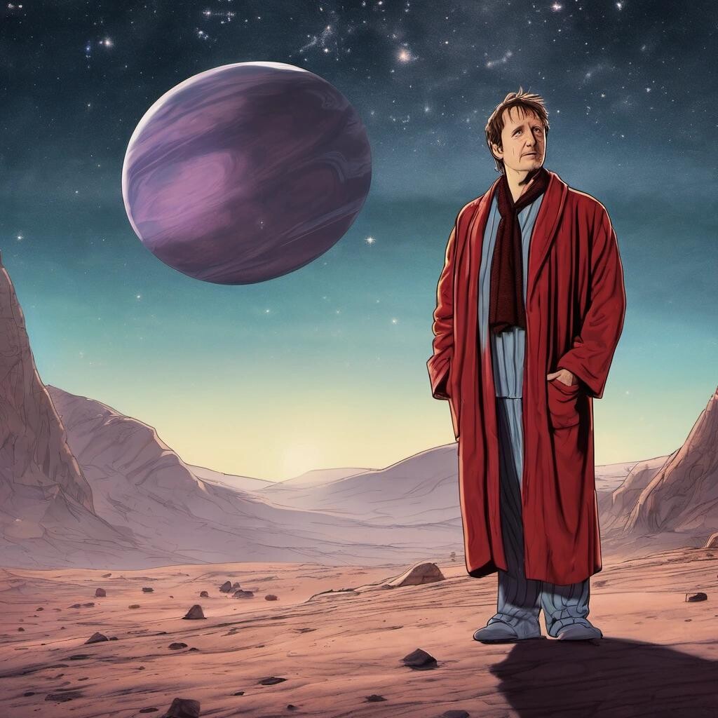 Prompt: Arthur Dent standing on a distant planet in his dressing gown and pyjamas