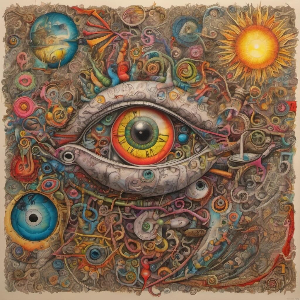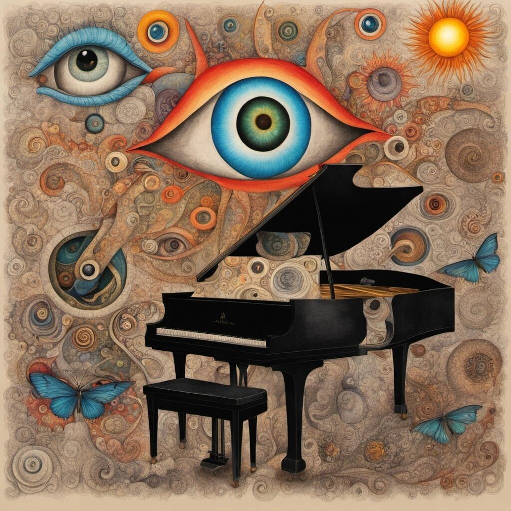 Prompt: The Eye of Chaos might be watching right now, surrealism, dada, train of thought drawing, cluttered, insane, eyeballs, butterflies, a grand piano, the sun clock, coloured pencils on rough paper, curlicues, zentangle patterns, extremely colourful, vibrant colours, suddenly very gay