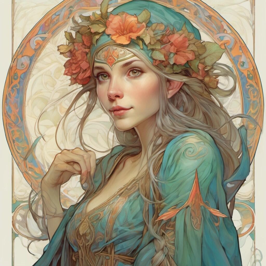 Prompt: beautiful elf, intricate, highly detailed, style by Àlphonsé Mucha, wide brush strokes, vivid colors