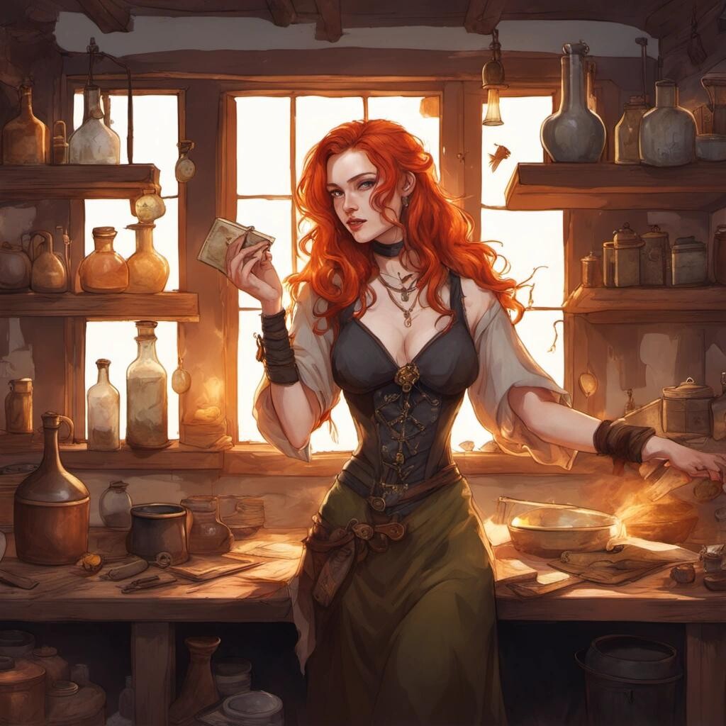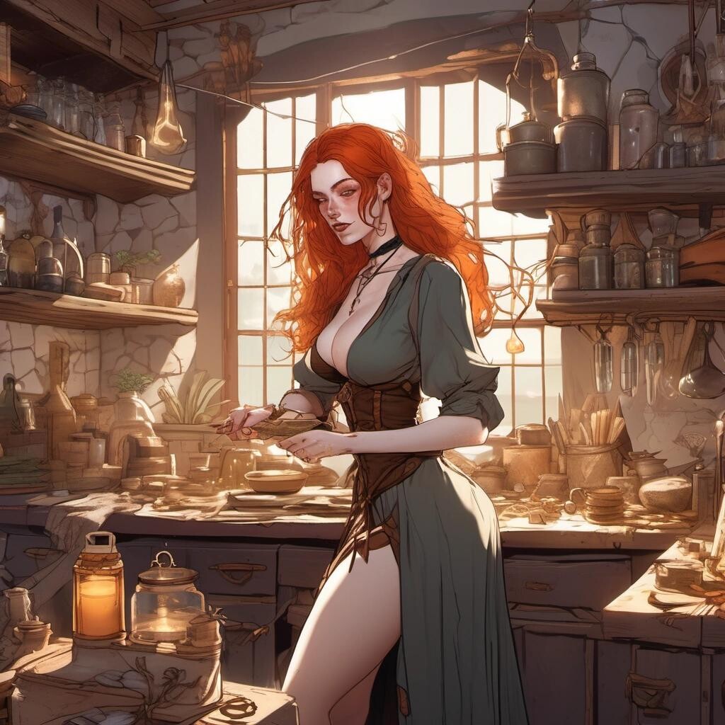 Prompt: A youthful pale-skinned redhead witch in revealing clothes, dirty and sweaty, working in her cottage kitchen crowded with equipment and spellbooks and amulets and crystals and flasks with potions. Very pale skin, freckles, wide hips, small breasts. Golden hour sunlight streaming in through the windows. Beautiful hands.