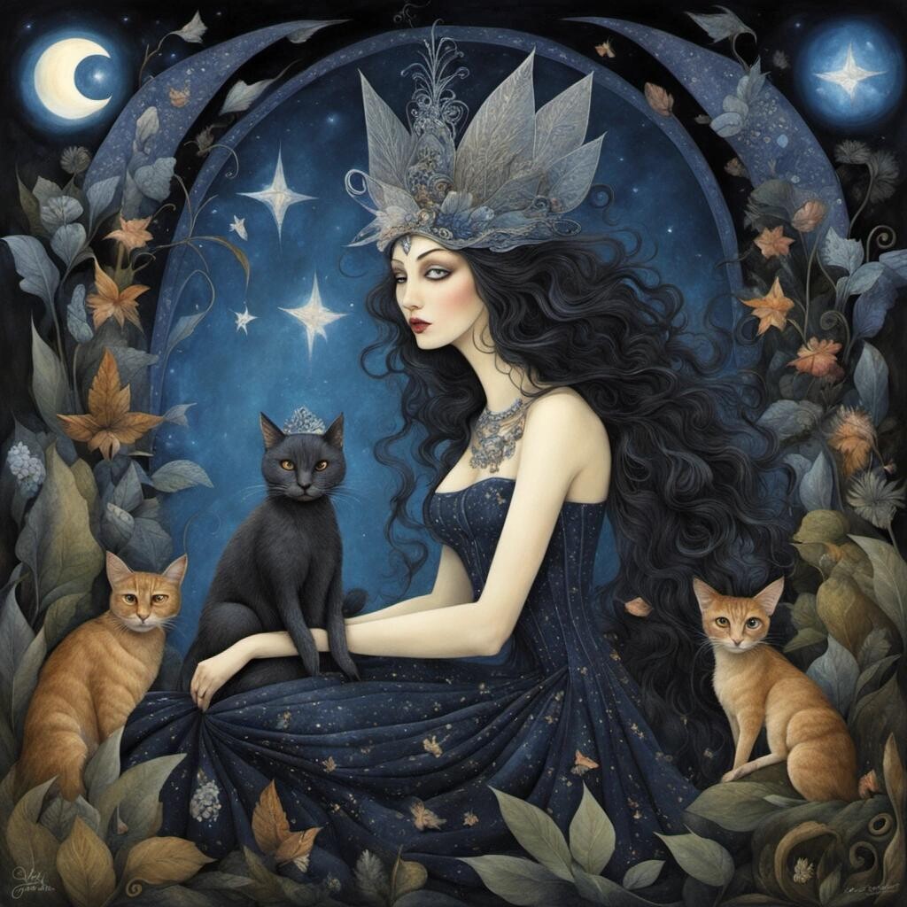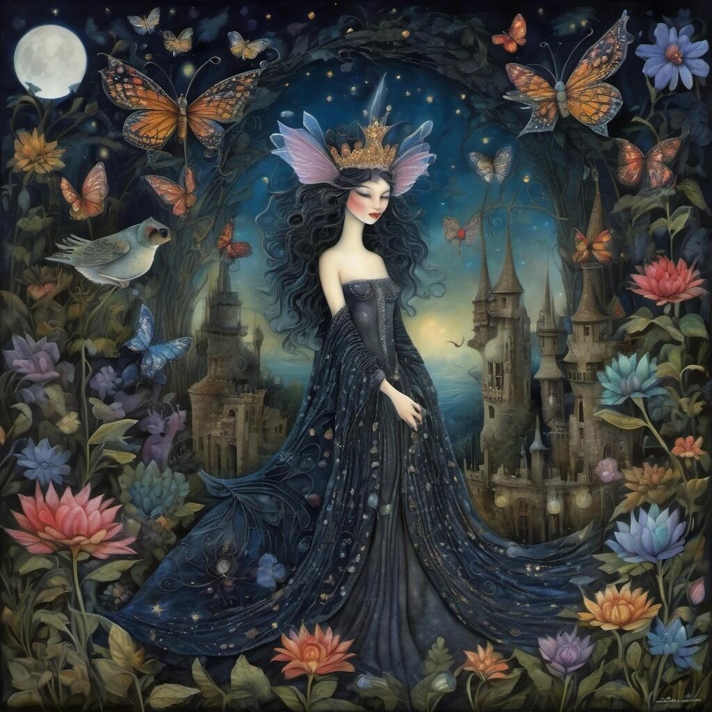 Prompt: Faerie Queen of the Night. Dark colors. whimsical, fantasy, whimsical background, by Didier Lourenço , Josephine Wall, Louis Wain, Jacek Yerka, Kevin Sloan