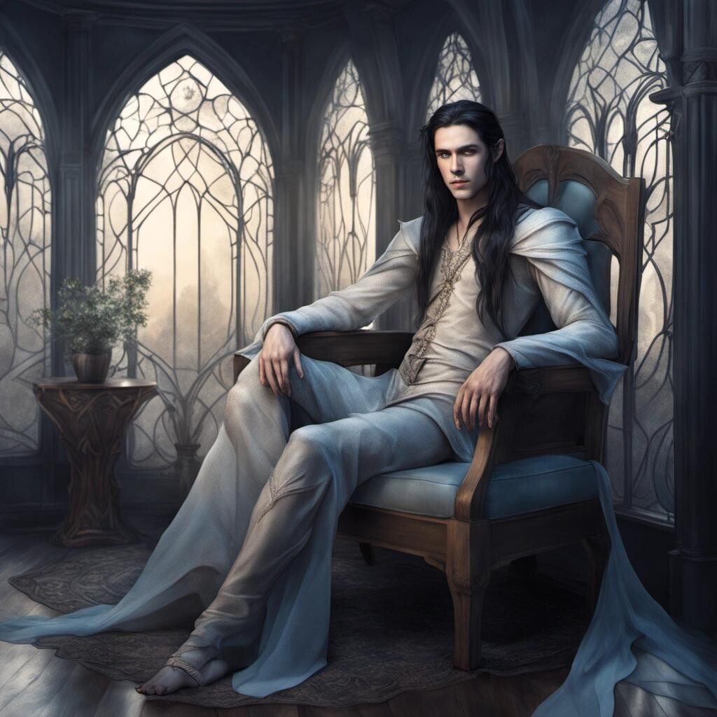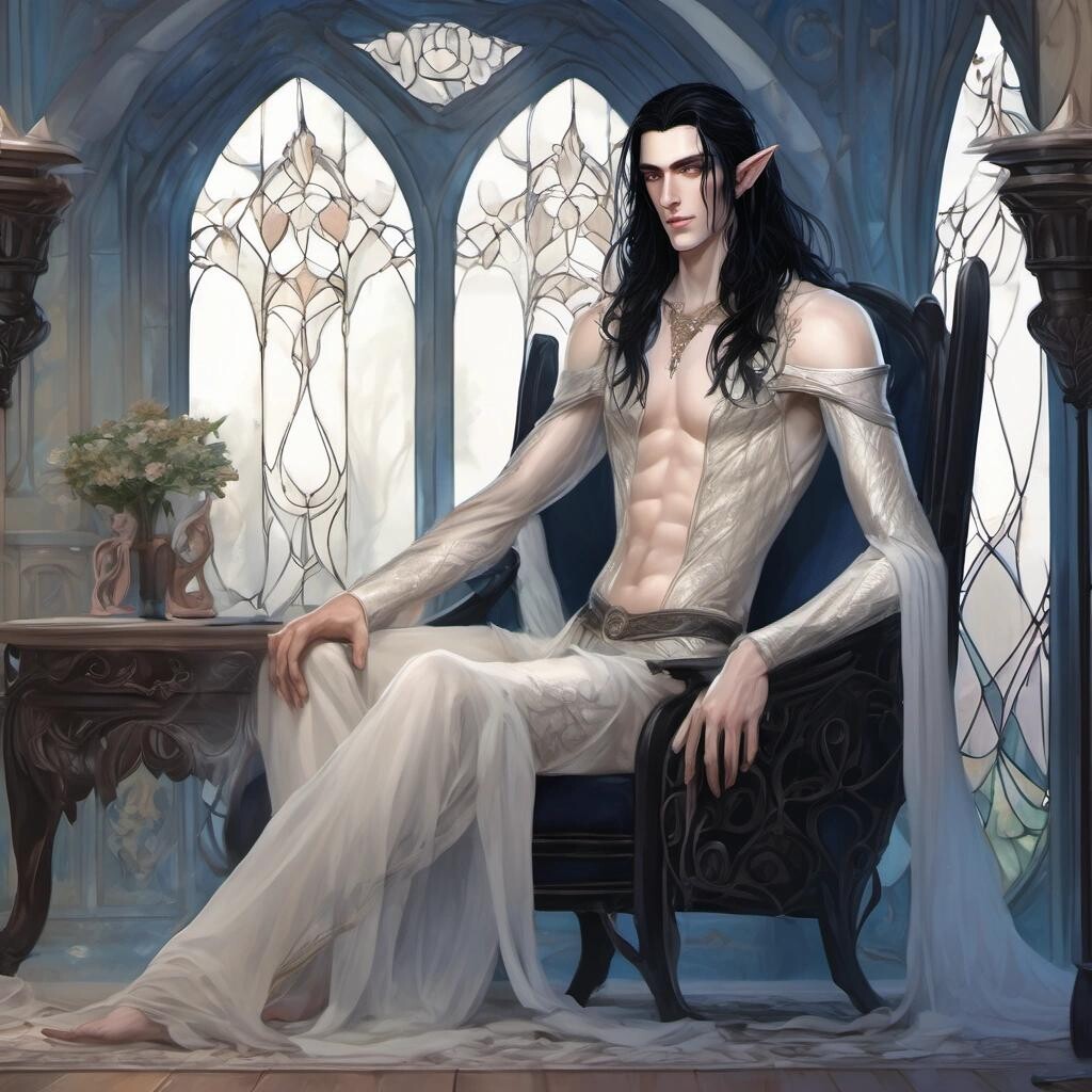 Prompt: Beautiful handsome High Elf prince, blue eyes, pale skin, very long black hair, transparent sheer clothing, barely clothed, sitting on a chair in the bedroom in a defiant pose, romantic Elven bedroom, fantasy architecture, art nouveau furniture, full Body Portrait