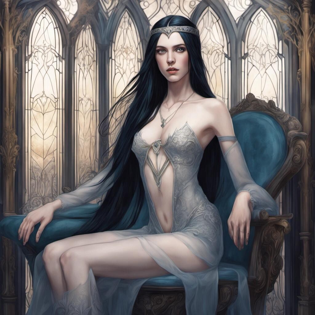 Prompt: Beautiful High Elf princess, blue eyes, pale skin, very long black hair, transparent sheer clothing, barely clothed, sitting on a chair in the bedroom in a defiant pose, romantic Elven bedroom, fantasy architecture, art nouveau furniture, full Body Portrait