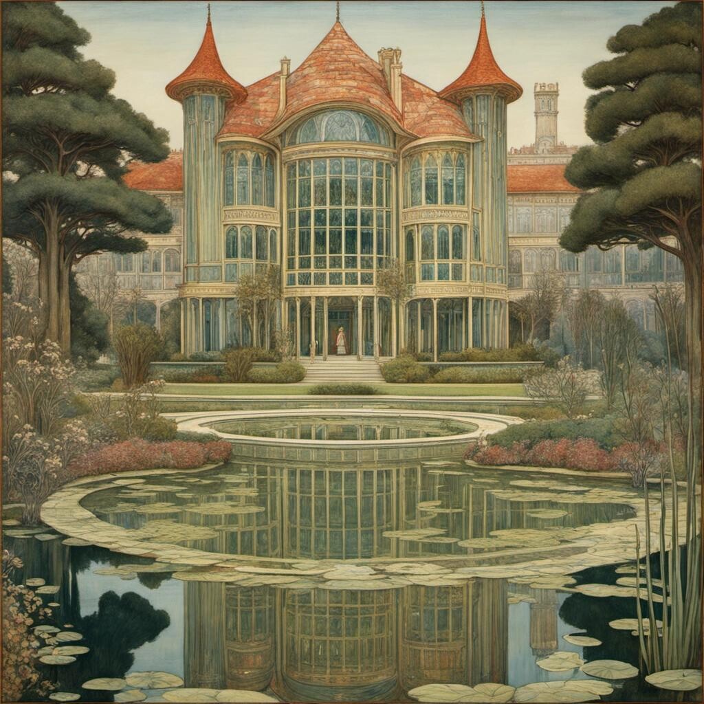 Prompt: art nouveau style, High Elven palace and garden with pond, by Walter Crane, intricate details, oil on canvas, colourful
