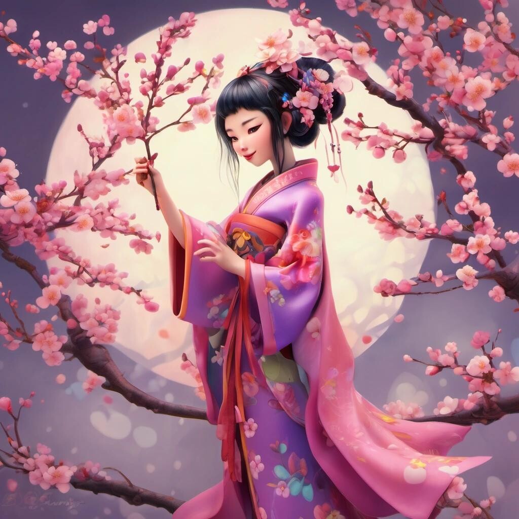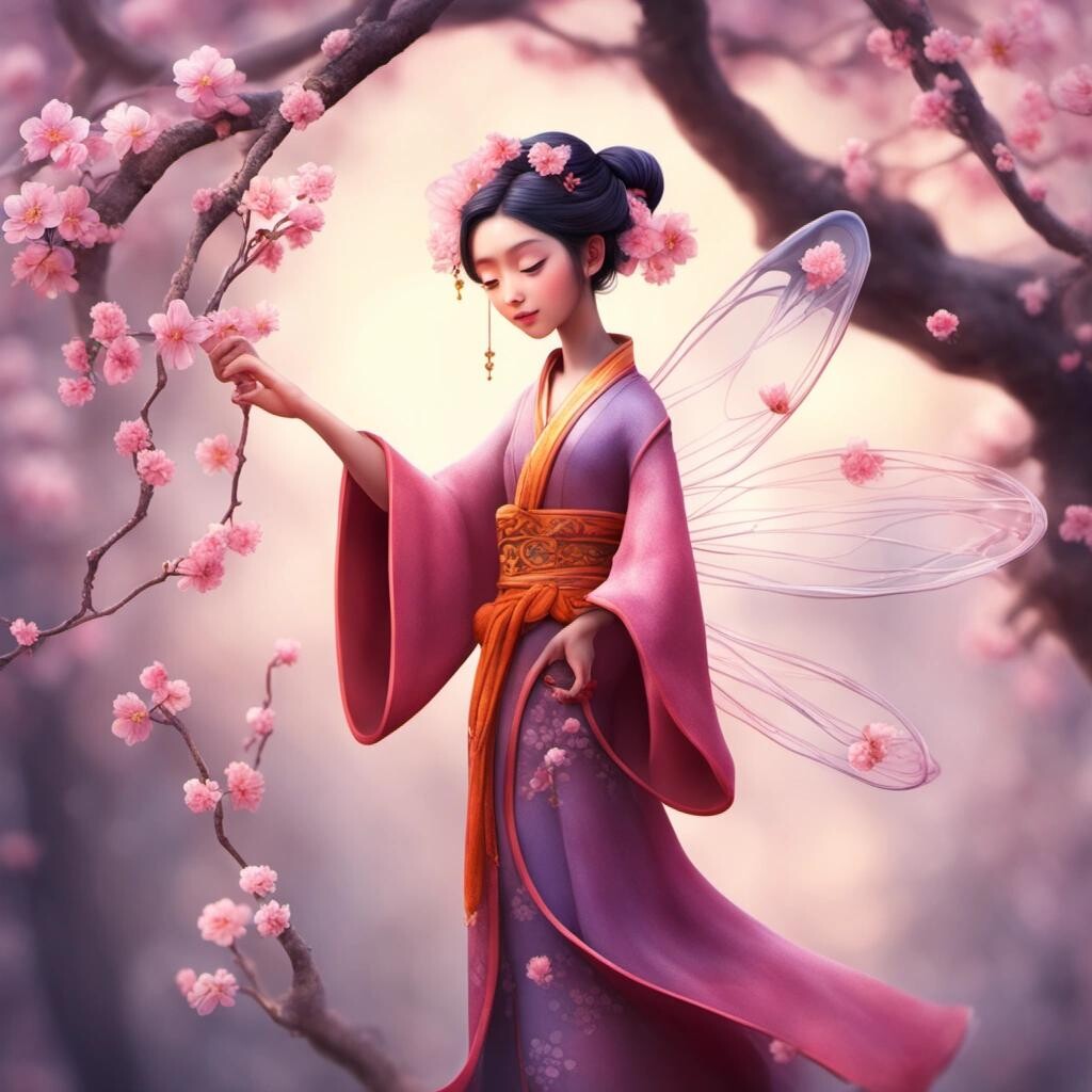 Prompt: Lady Plum Blossom, Chinese spring fairy, beautiful, playful, whimsical, fantasy, intricate, very attractive, beautiful, colourful, very cute, pixar, dreamlike