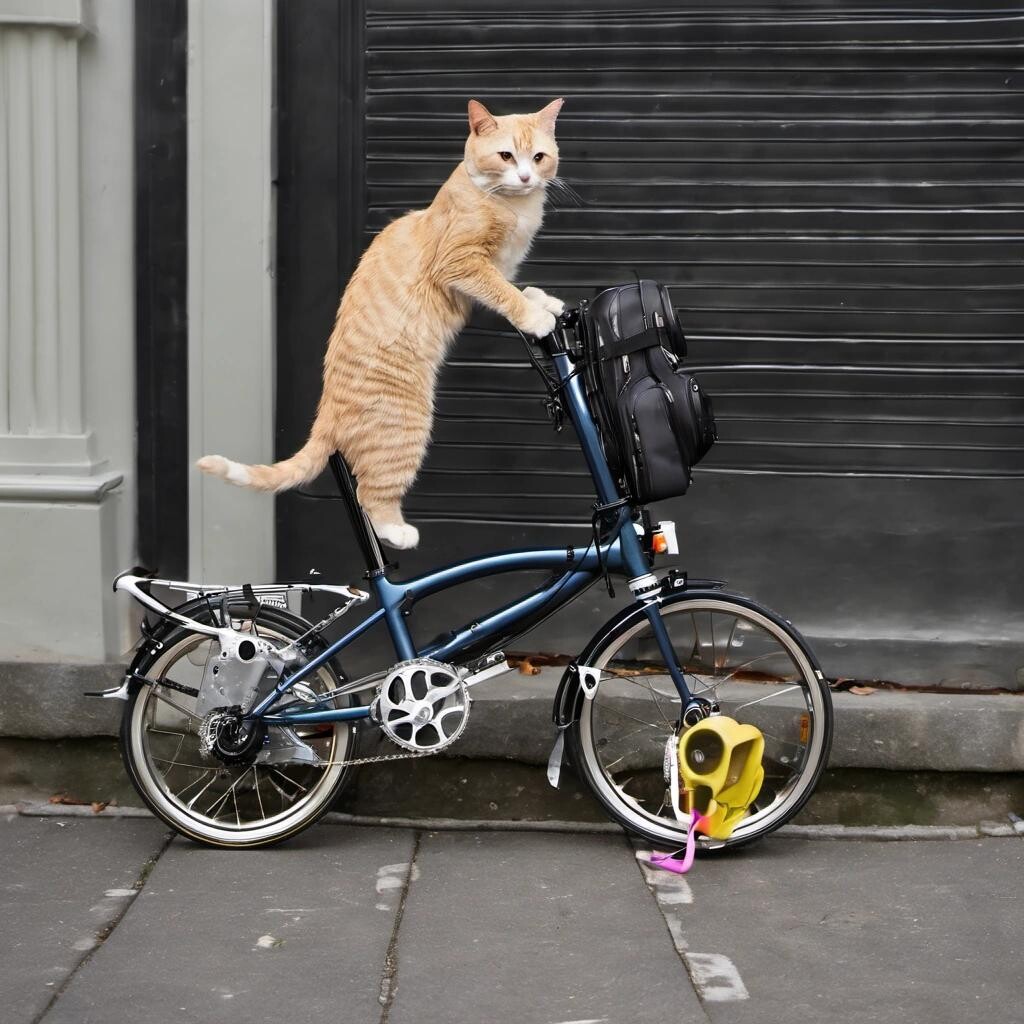 nostr:npub1p5qe4mtwxascahtp6szght2nlp06gwwwwllq7e7g6308p4y9dvys8nw2sf draw for me a cat on a brompton