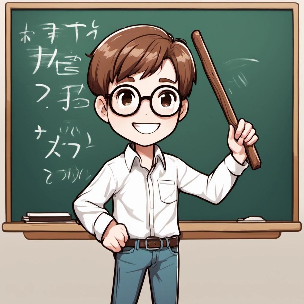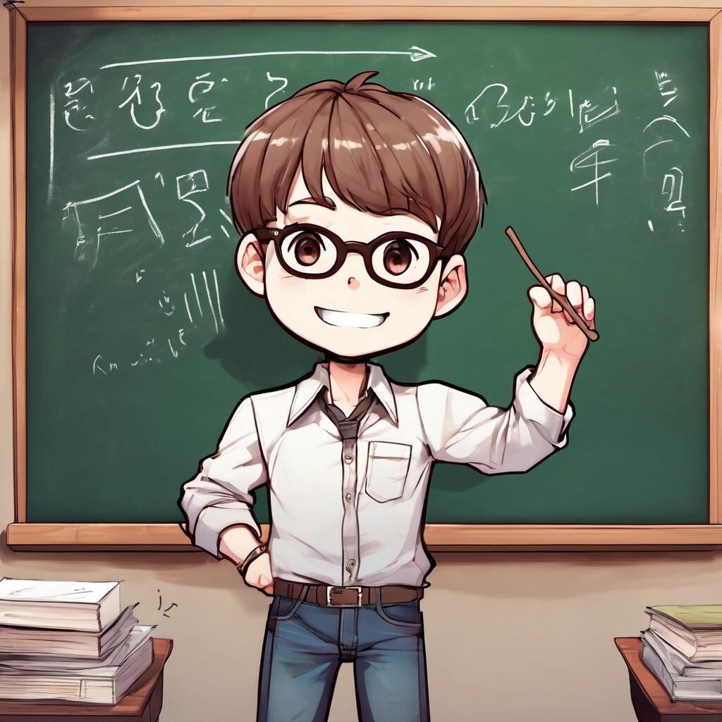 Prompt: a white man with glasses, short brown hair white skin whith a shirt and a jean in front of a blackboard with a wood stick in its right hand. Its head is bigger than the rest of the body. He look like happy to teach. White background.Style : coloured manga chibi