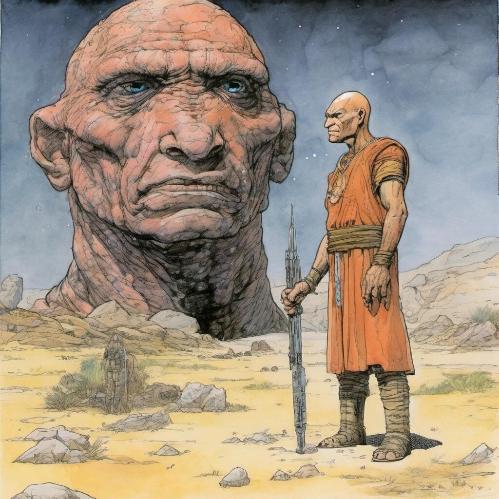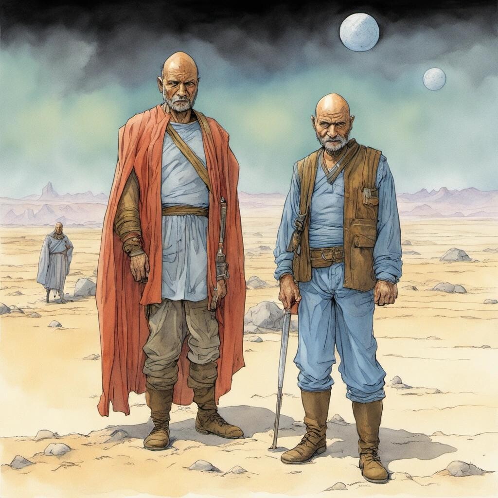 Prompt: Darmok and Jalad at Tanagra, comic book, graphic novel, watercolour on black ink drawing by Jean Giraud aka Moebius, science fiction, scifi, fantasy