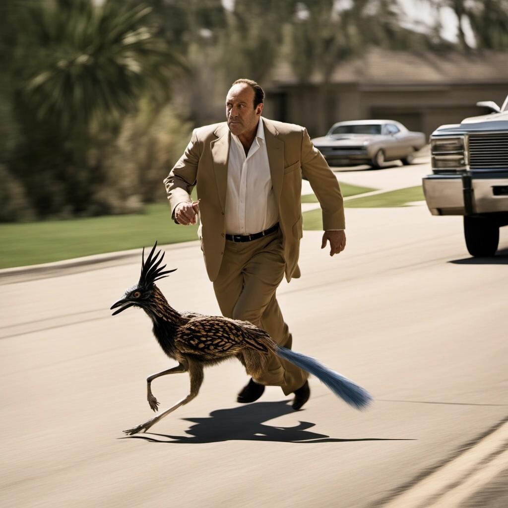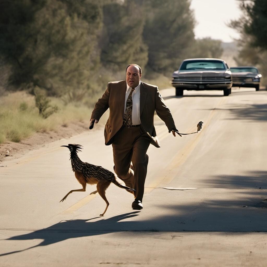 Prompt: tony soprano dressed as the roadrunner, being chased by a coyote