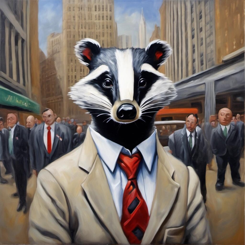 Prompt: oil painting of a very sad anthropomorphic badger wearing a necktie, stock exchange in the background