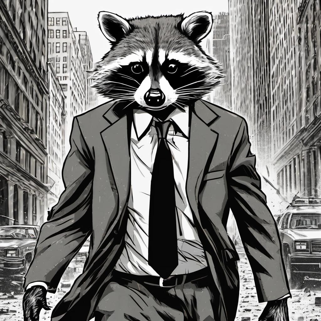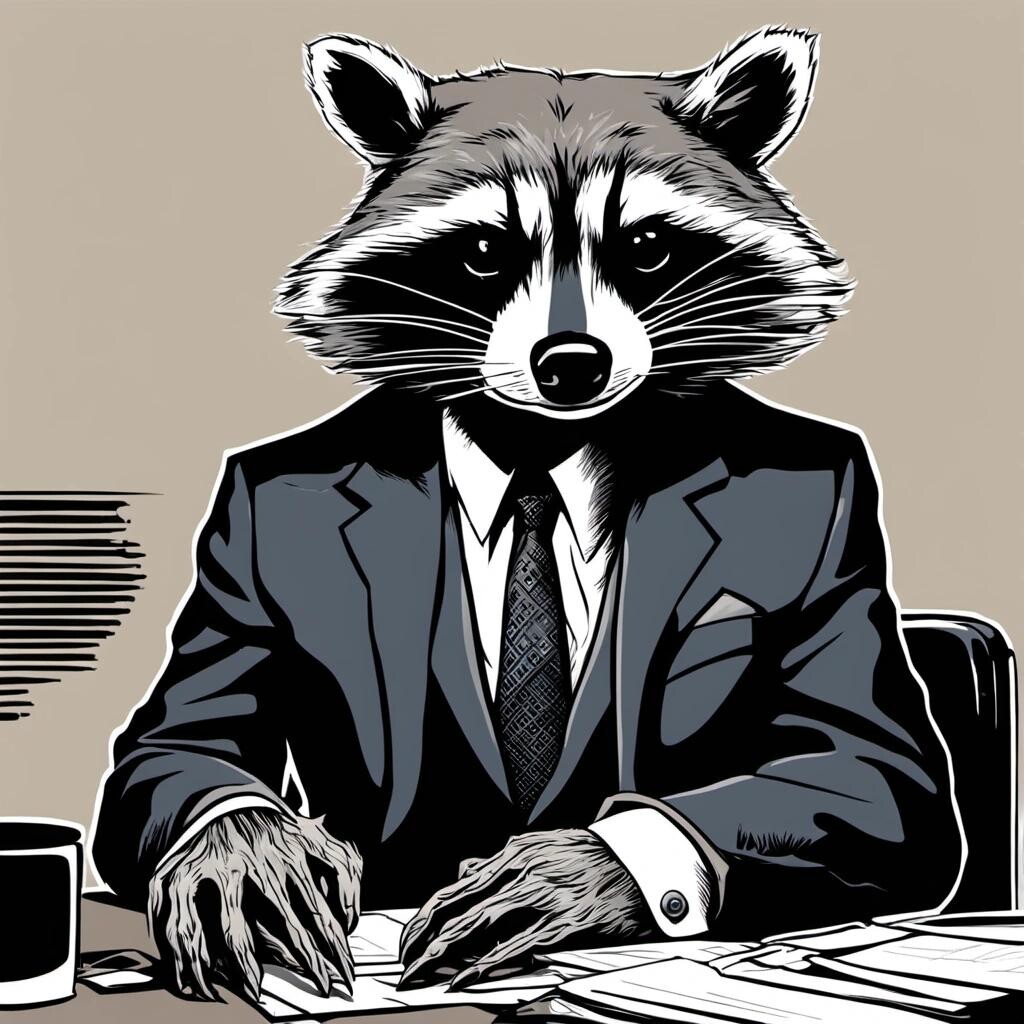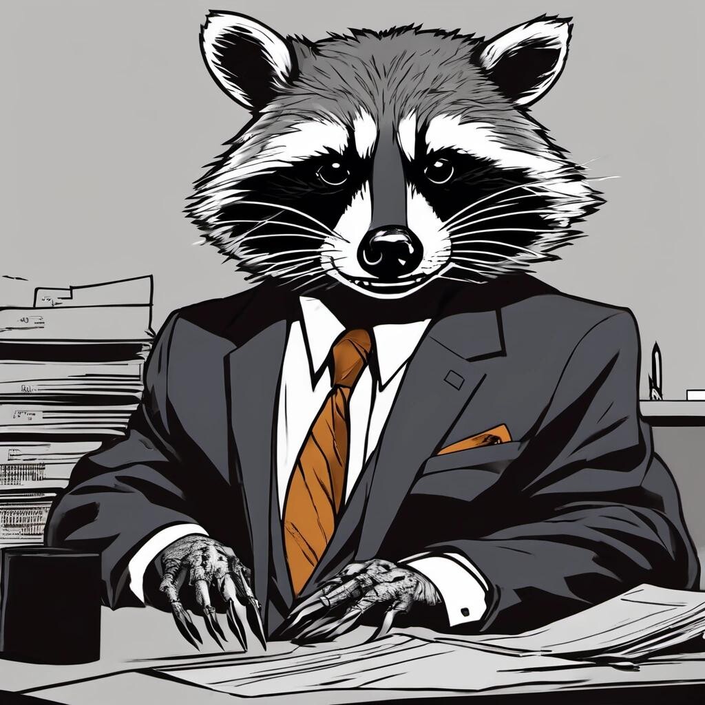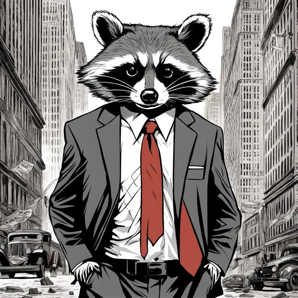 nostr:npub1p5qe4mtwxascahtp6szght2nlp06gwwwwllq7e7g6308p4y9dvys8nw2sf draw for me racoon in business suit wall street spooky death cult