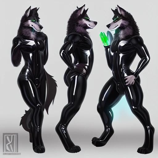 Prompt: an anthromorph black and dark green wolf dog in a latex rubber suit.