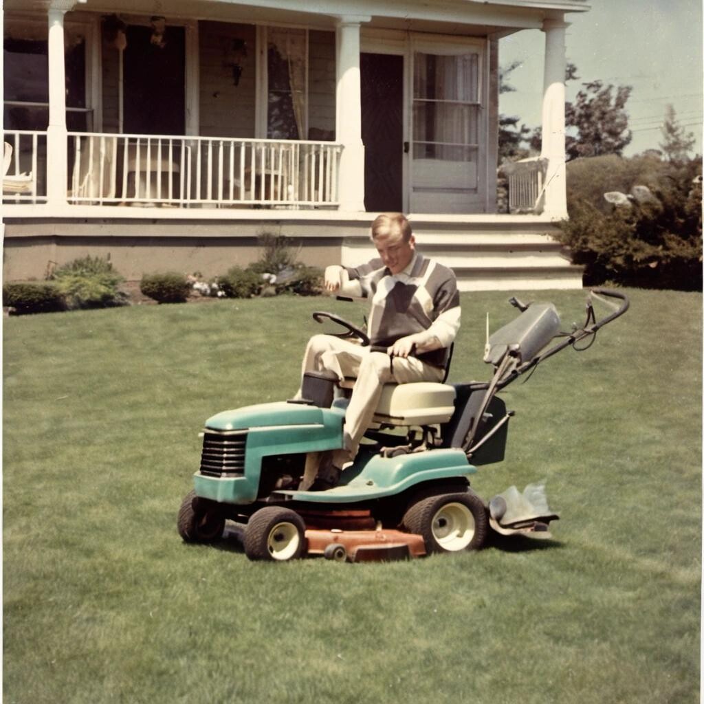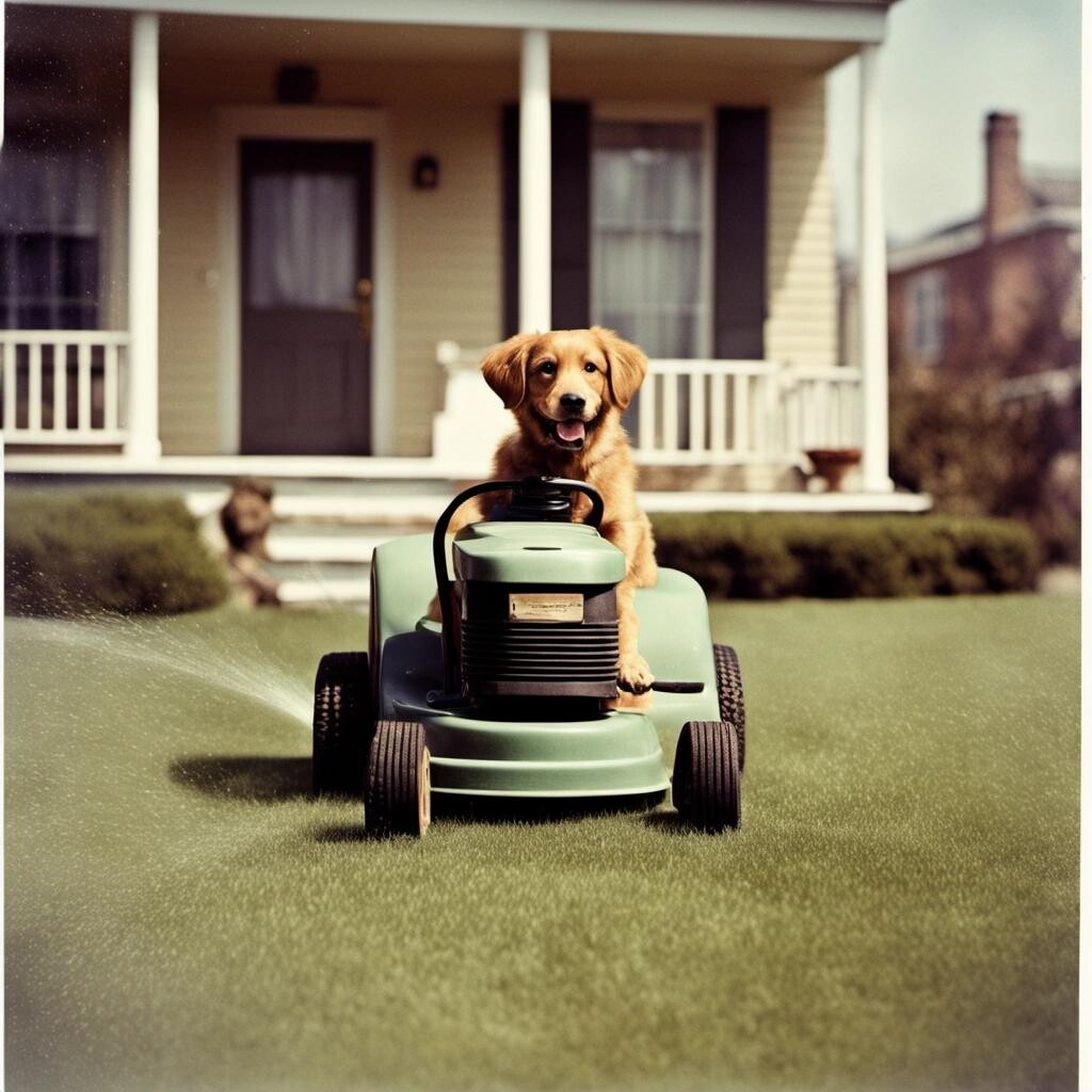 Prompt: a faded home photo from the 1960s of a dog mowing a lawn on a riding lawn mower