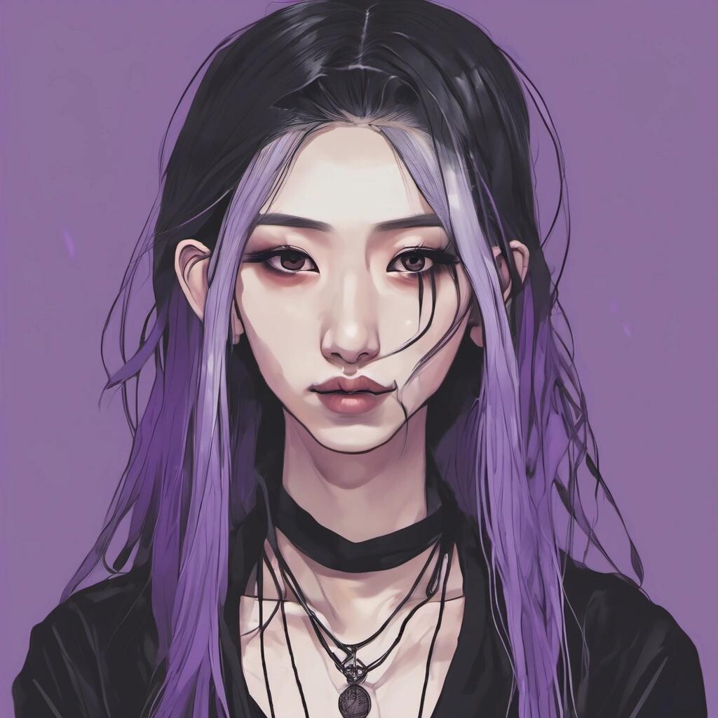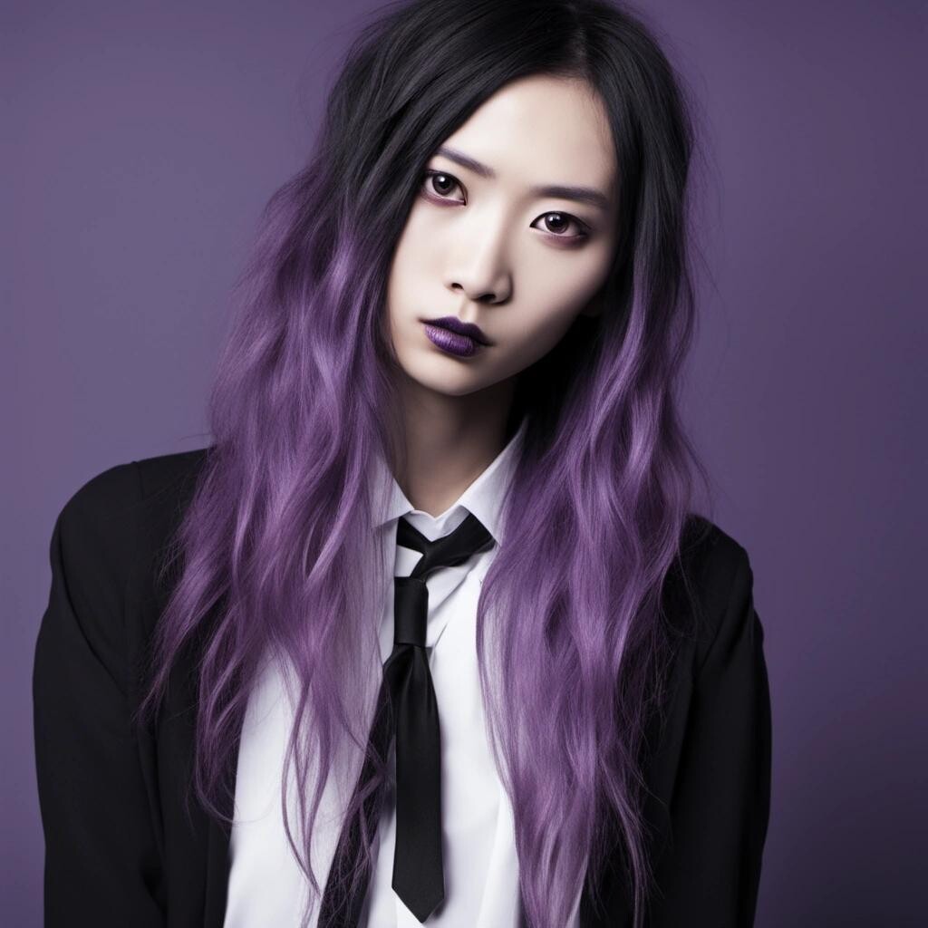 Prompt: a beautiful 25 year old skinny androgynous Asian goth with long purple hair