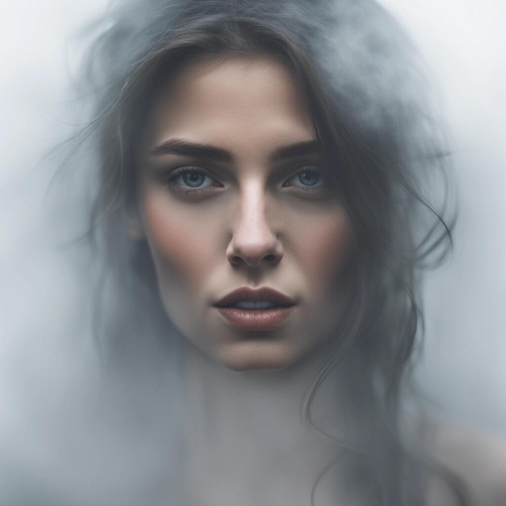 Prompt: Face of a beautiful young woman emerging from the mist and fog