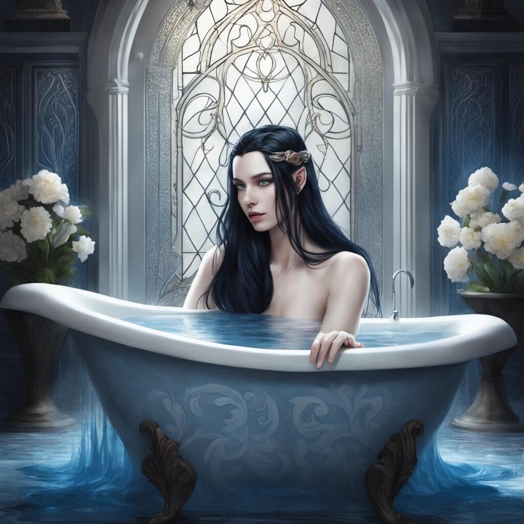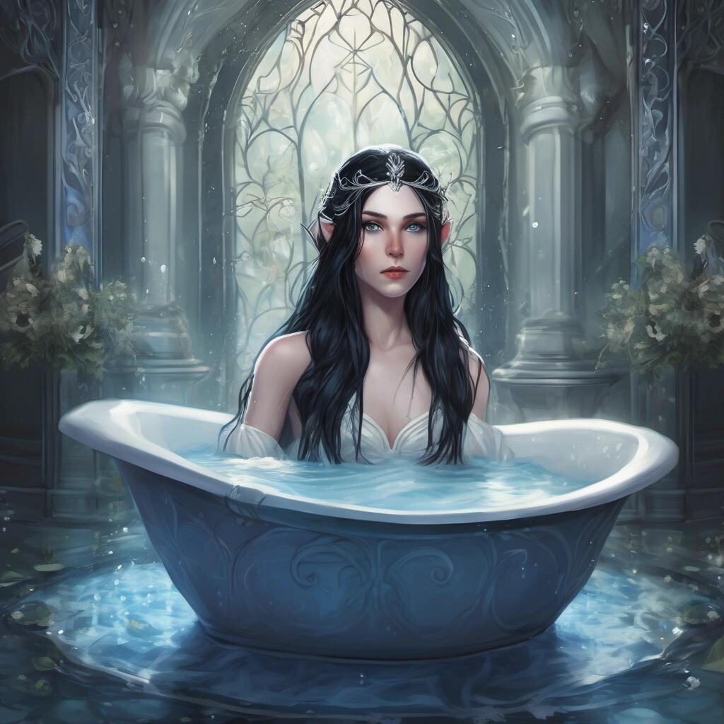 Prompt: Elven Queen taking a bath in her luxurious bathtub, long black hair, pale white skin, pointy ears, beautiful blue-grey eyes, angelic face