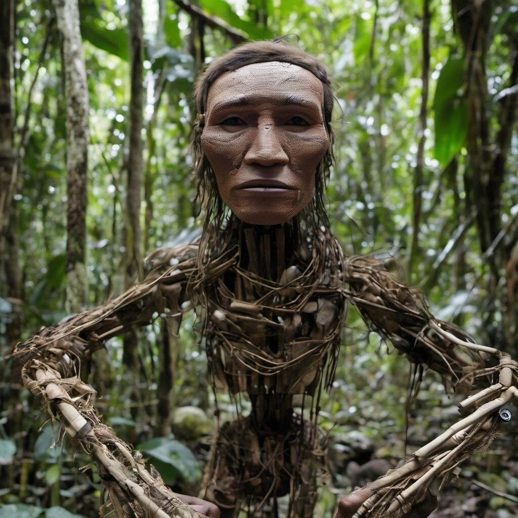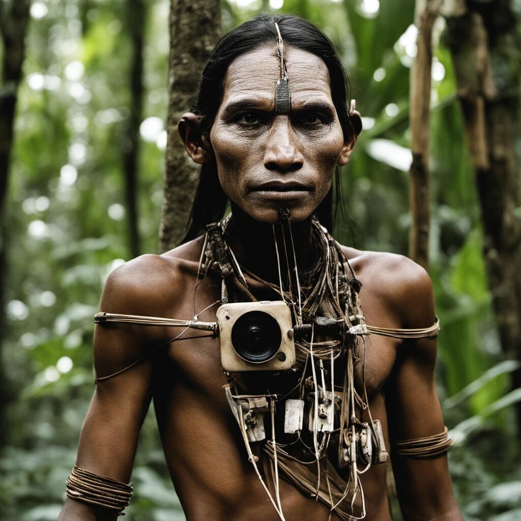 Prompt: a humanoid robotic spy camera living with an indigenous tribe of uncontacted peoples
