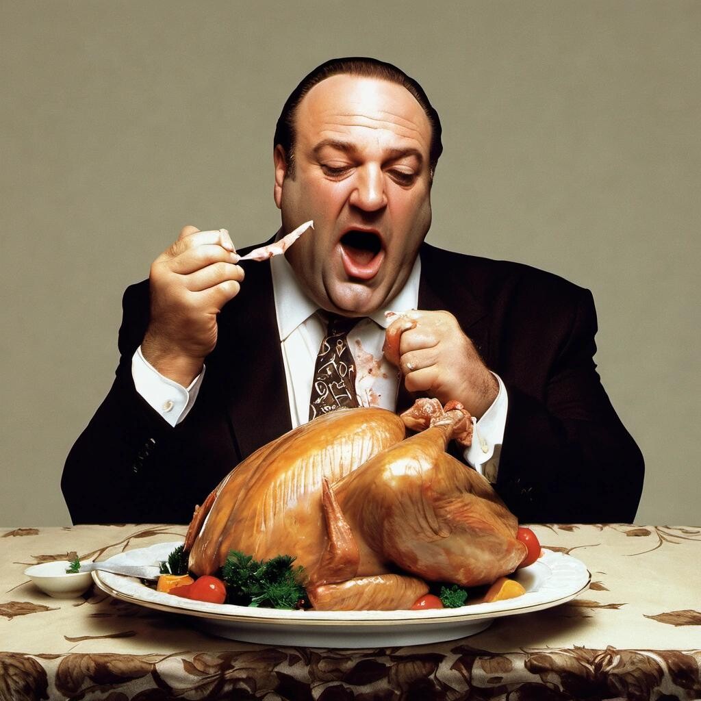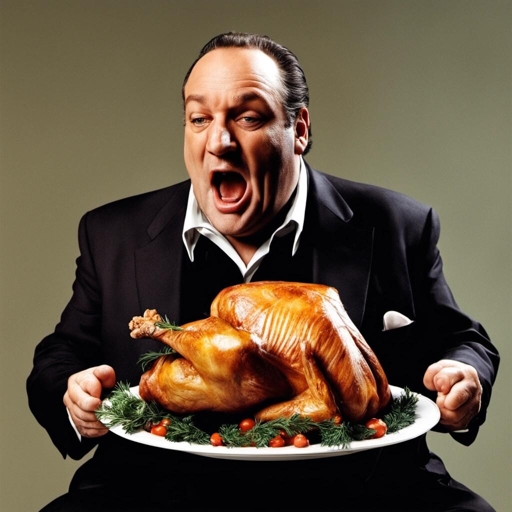 Prompt: tony soprano hold a fully cooked frozen turkey in his mouth